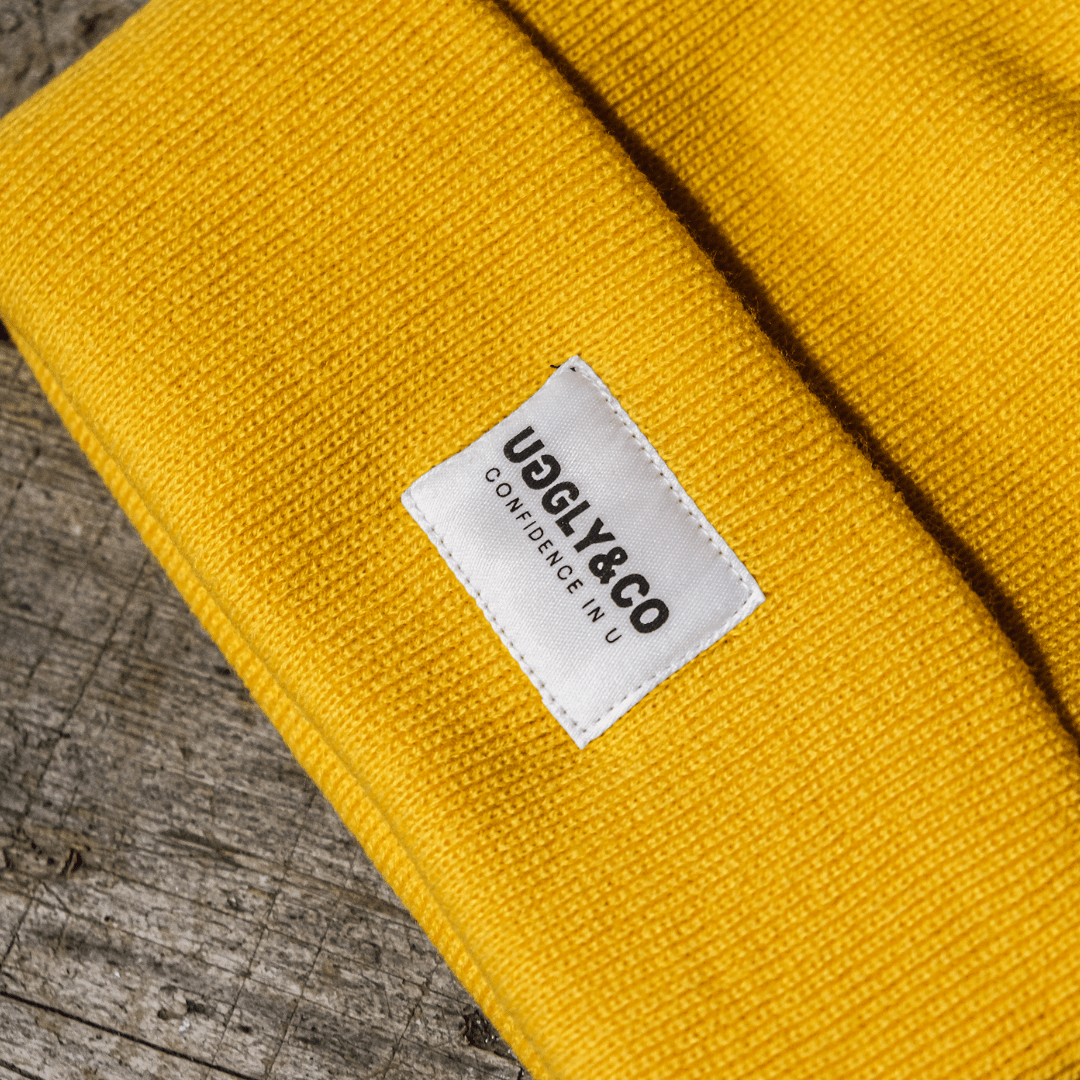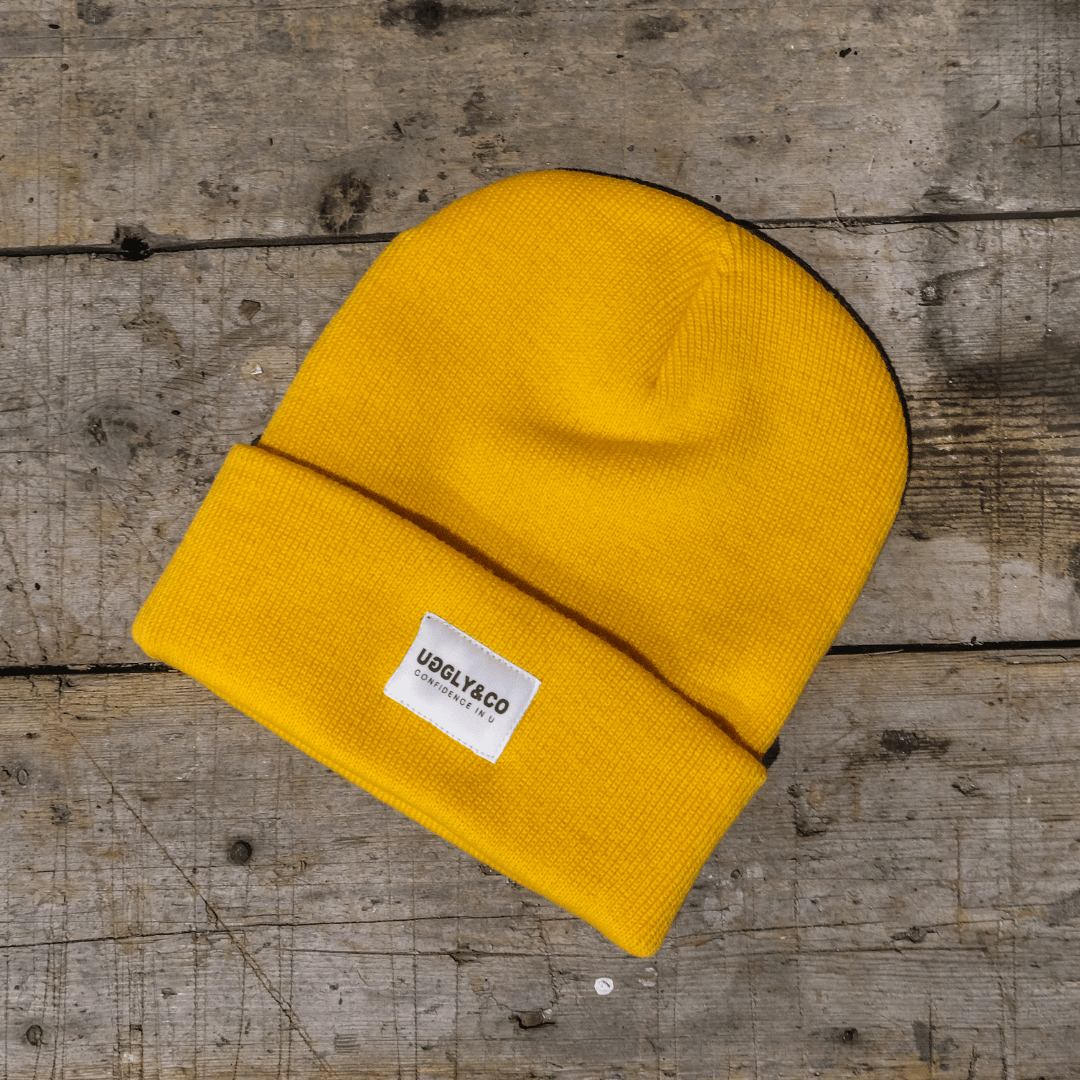 The UGGLY&CO Gold Yellow Beanie. A bright yellow beanie with the classic UGGLY&CO design woven on to the front.