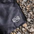 The shorts feature an all-over, vintage-style hand-drawn wave texture in deep black and dark grey tones. The pattern is intentionally subtle, giving the trunks a rich, layered look that reveals more the closer you get. Instead of bold graphics, the only branding is a small rubber Diamond logo badge on the left leg — clean, sharp, and quietly confident.