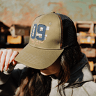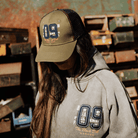 This cap features a deep green cotton front and peak, paired with a black mesh back for that classic trucker style and all-day breathability. The front showcases a clean white Parts & Spares print, overlaid with a rugged black '09' appliqué, frayed and softened through our signature vintage wash for that well-worn, retro feel.