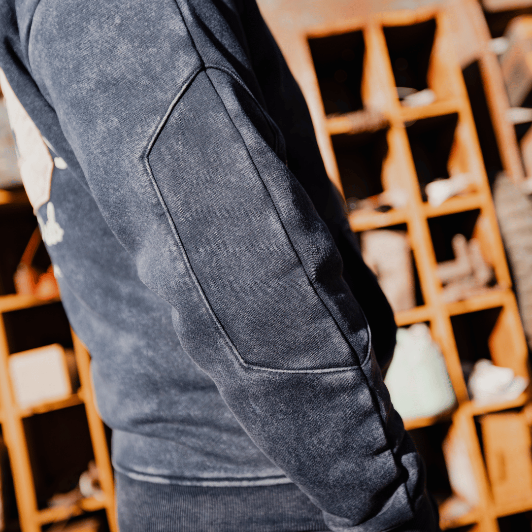 And then come the details. A spanner is embroidered into the cuff of the sleeve — a subtle mechanic’s signature — with the head sized at exactly 9mm, calling back to the iconic 9th milestone. The hoodie is cut in a vintage raglan silhouette — no shoulder panels here, just sleeves that run clean to the neckline for that timeless, heritage fit. Elbow panels add a touch of vintage workwear utility, while contrast-colour seams are added across key areas to give the hoodie an intentionally unfinished, workshop-built edge.