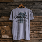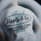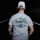 Crafted with meticulous care, the tee features a small logo delicately placed on the front in soft gold and deep blue print, adding a refined touch of elegance. The true highlight, however, is the large vintage-inspired graphic on the back, carefully hand-sketched in-house and then digitized for an authentic, retro feel. The deep blue and soft gold color palette sets this tee apart, offering a refined yet striking visual effect that makes a bold statement.