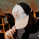 This trucker cap features a stone-coloured cotton front paired with a tanned peak, and finished off with a black mesh back for breathability and everyday wear. The earthy tones give it a clean but rugged feel, easy to pair with anything from leathers to laid-back layers.