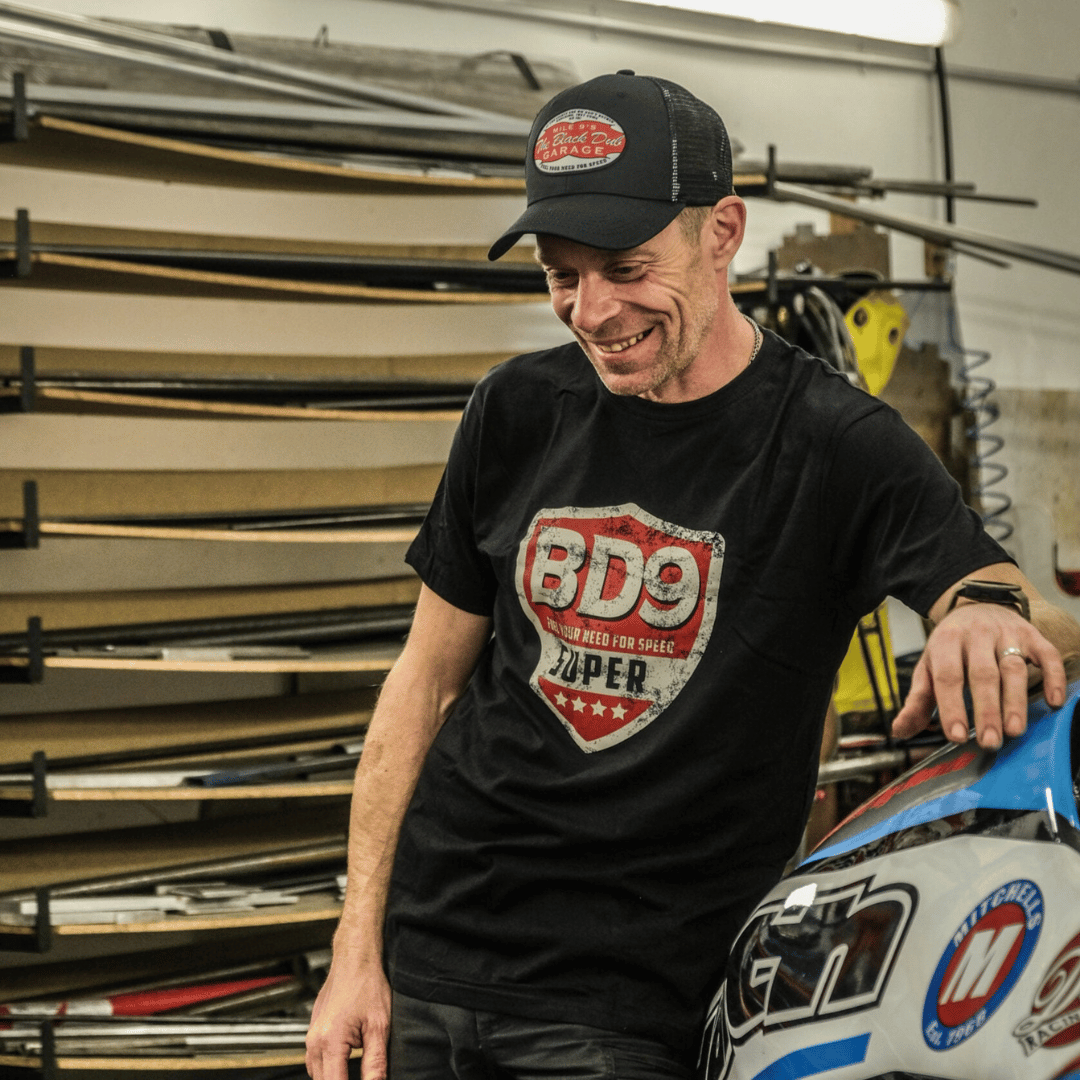 The Super Shield T-shirt, is part of The Black Dub Collection. With inspiration taken from The Black Dub, Mile 9’s roots of a Motorcycle Garage & Petrol Station situated on mile 9 of the infamous Isle of Man TT Course.