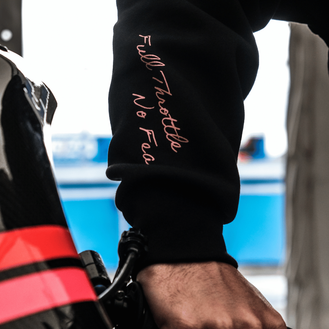 The back of the hoodie features a hand-drawn sketch of Davey Todd moments before the start of the 2024 Senior TT – the very race he went on to win. Lightning bolts strike through the artwork, giving it a raw, vintage rock concert vibe, blending speed and rebellion into one powerful design. On the sleeve, the words "Full Throttle. No Fear." run boldly down the arm – a mantra for anyone who pushes limits and lives for the ride.