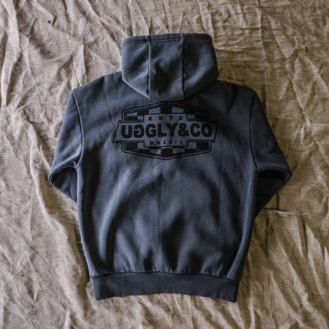 Part of the Chequered Logo design range, this hoodie features the bold Uggly&Co badge logo across the back — a staple look from one of our core collections. Made in a deep washed tone for a lived-in feel, it carries the same rugged, garage-inspired energy that defines the brand.