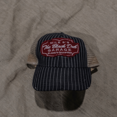 The Pinstripe Garage Cap Sample features the classic blue-and-white workwear pinstripe front, created during the early development stage before full production. The build quality is slightly lower than the final retail version, and the price reflects that — making it a great chance to grab a Garage cap for cheap.