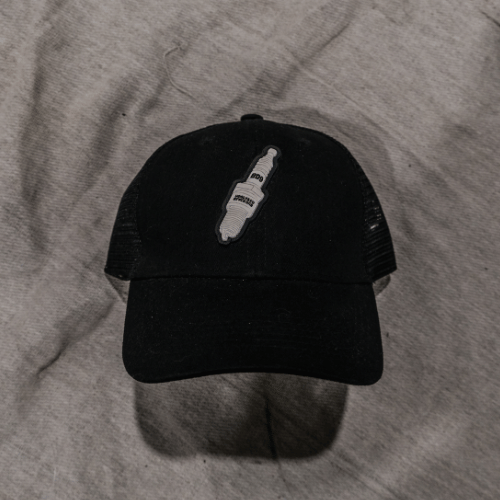 The Black Cap Sample features a gritty, dirty-white spark plug design on the front, giving it a raw garage-inspired look straight from the early development phase. With subtle differences from any final versions, it’s a standout one-off piece with proper workshop character.