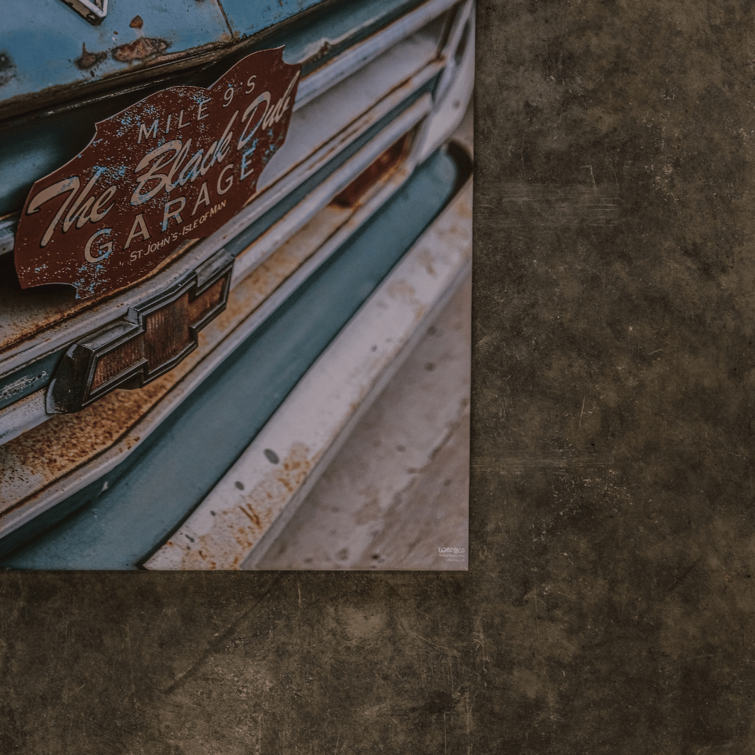 Celebrate vintage charm with "Pickup Perfection," a canvas that captures the rugged beauty of a classic Chevrolet truck. The close-up shot reveals the weathered front end, with a patina finish that tells stories of the open road. Adding a unique touch, the faded "The Black Dub Garage" sign sits proudly on the grille, evoking nostalgia for the Isle of Man’s iconic garage on the TT course at Mile 9.