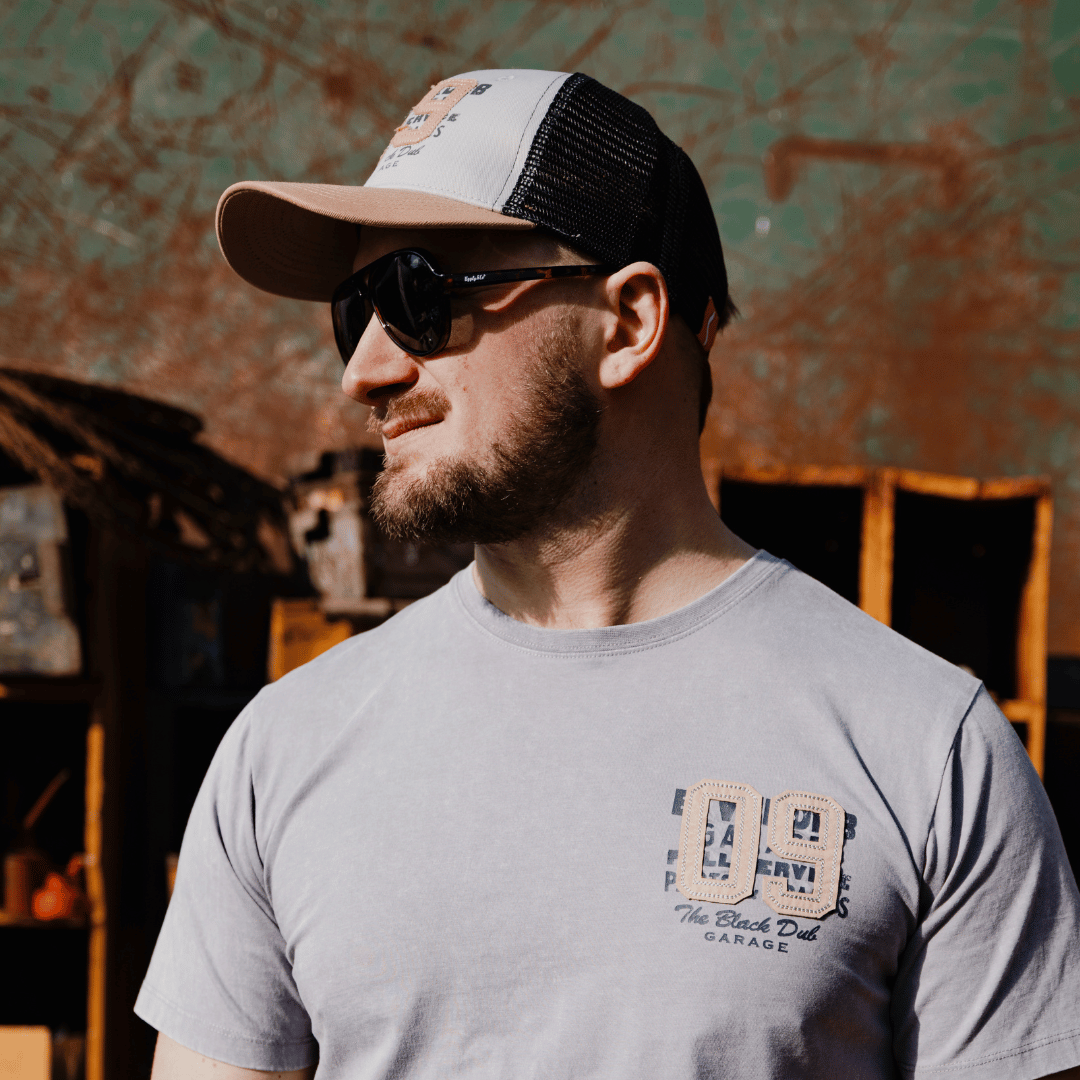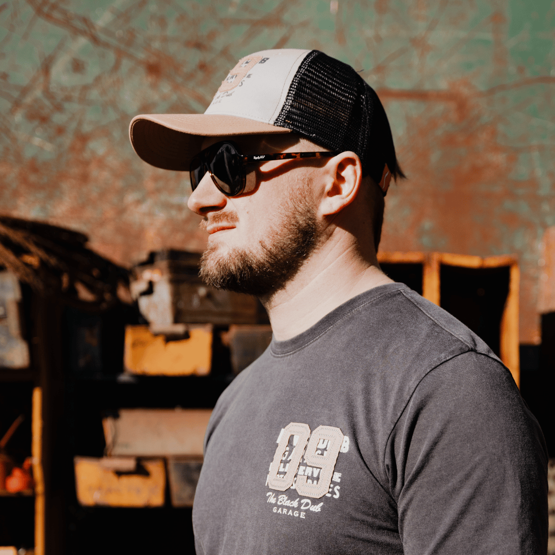 This trucker cap features a stone-coloured cotton front paired with a tanned peak, and finished off with a black mesh back for breathability and everyday wear. The earthy tones give it a clean but rugged feel, easy to pair with anything from leathers to laid-back layers.