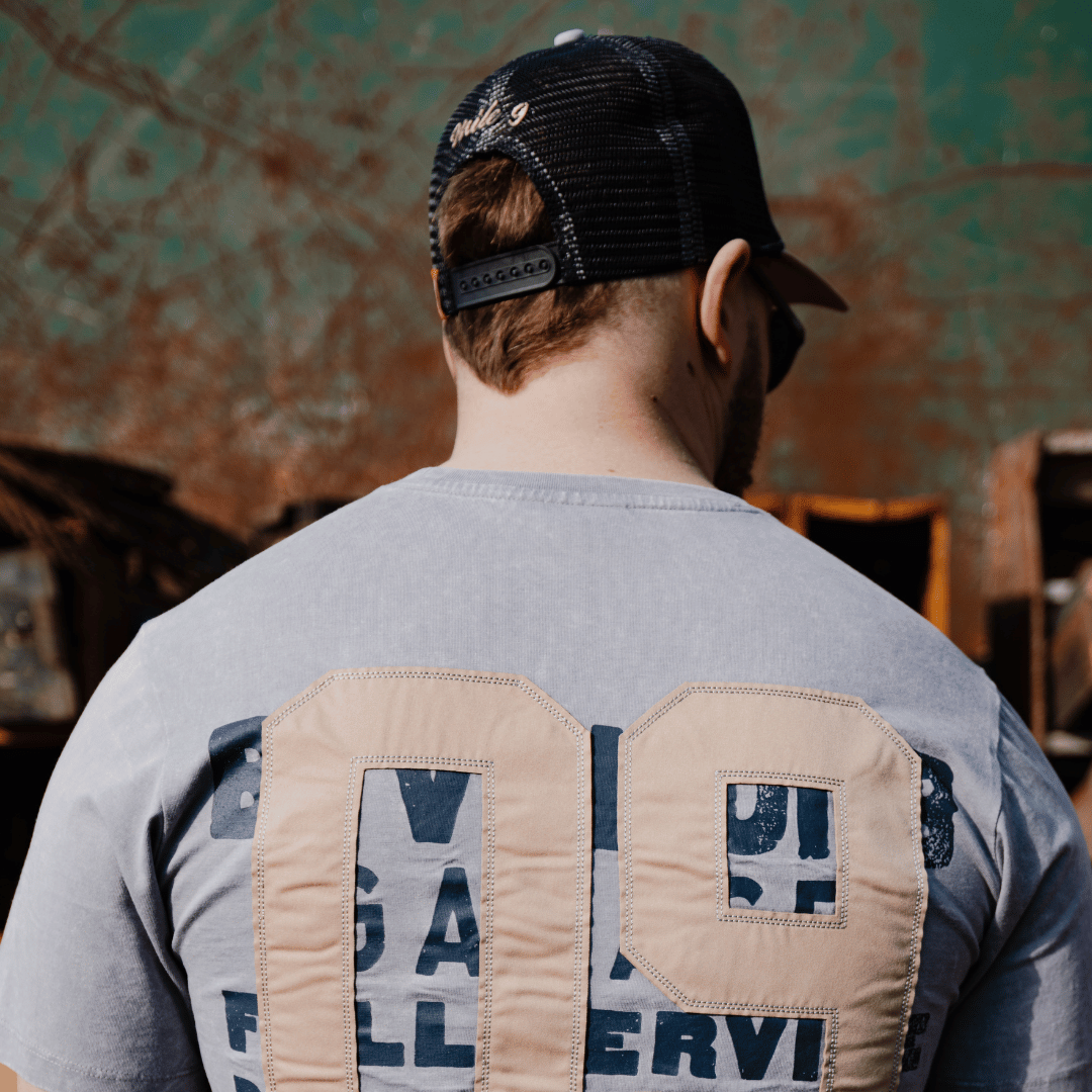 Across the front sits our Parts & Spares logo, printed in a deep dark blue, with a bold ‘09’ appliqué stitched over in matching tanned fabric. The appliqué has been washed and weathered, giving the cap a soft, worn-in look with subtle fraying that feels straight from the paddock.