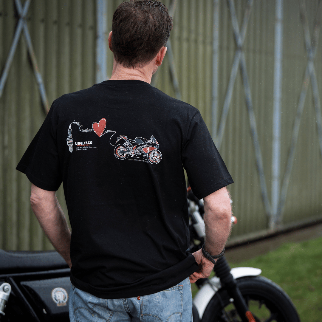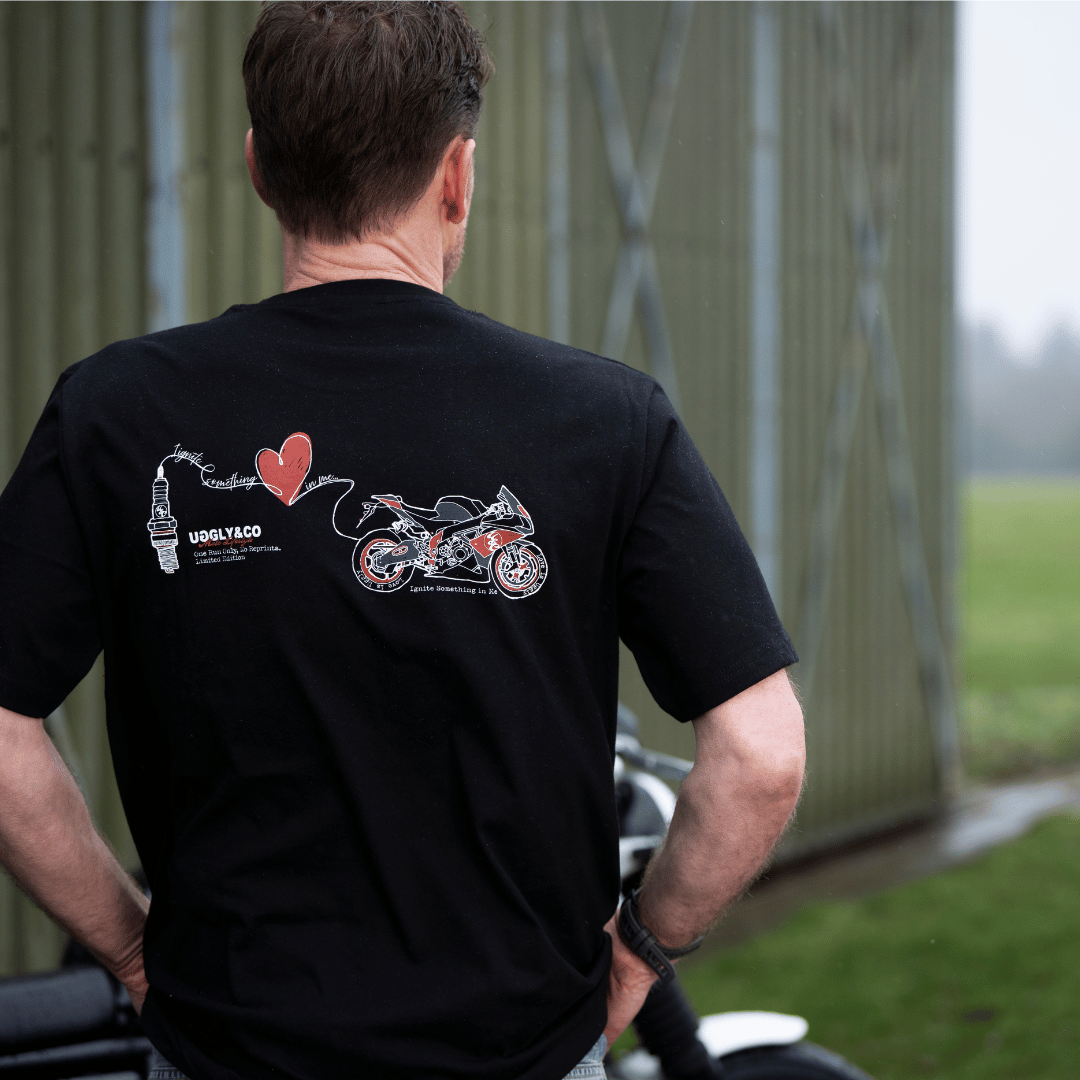 This limited run piece lands in black with hand-sketched artwork across the chest, featuring a spark plug wired into a heart and a race bike illustration. The message says it all – You Ignite Something In Me. Finished with Love is Uggly detailing, it’s raw, mechanical and straight from the garage.