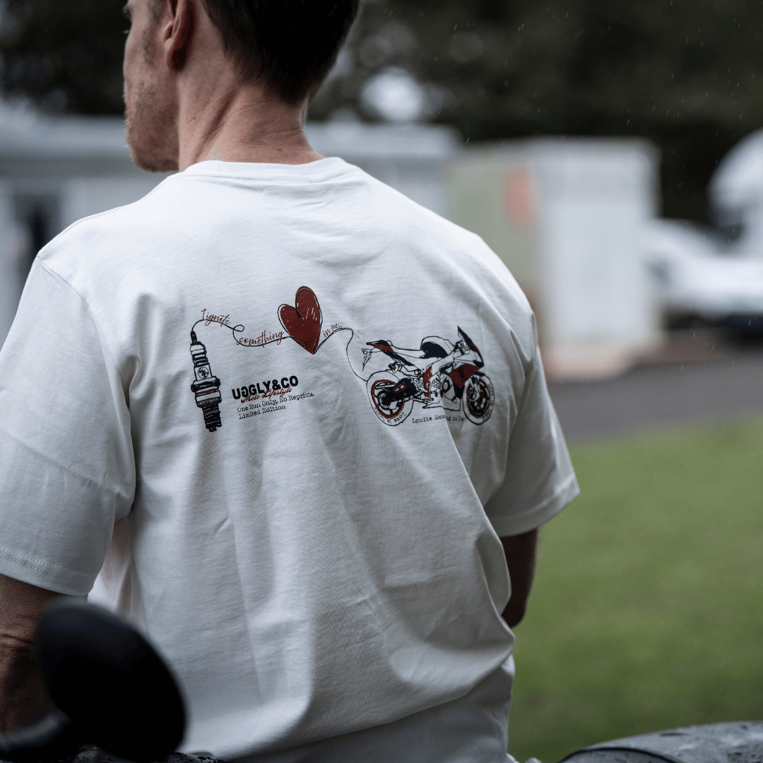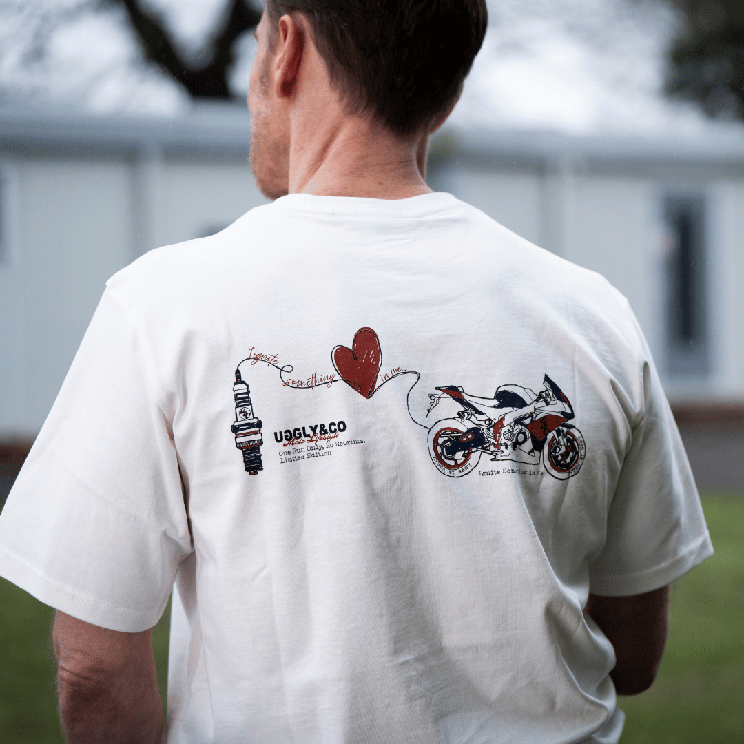 This limited run piece lands in white with hand-sketched artwork across the chest, featuring a spark plug wired into a heart and a race bike illustration. The message says it all – You Ignite Something In Me. Finished with Love is Uggly detailing, it’s raw, mechanical and straight from the garage.