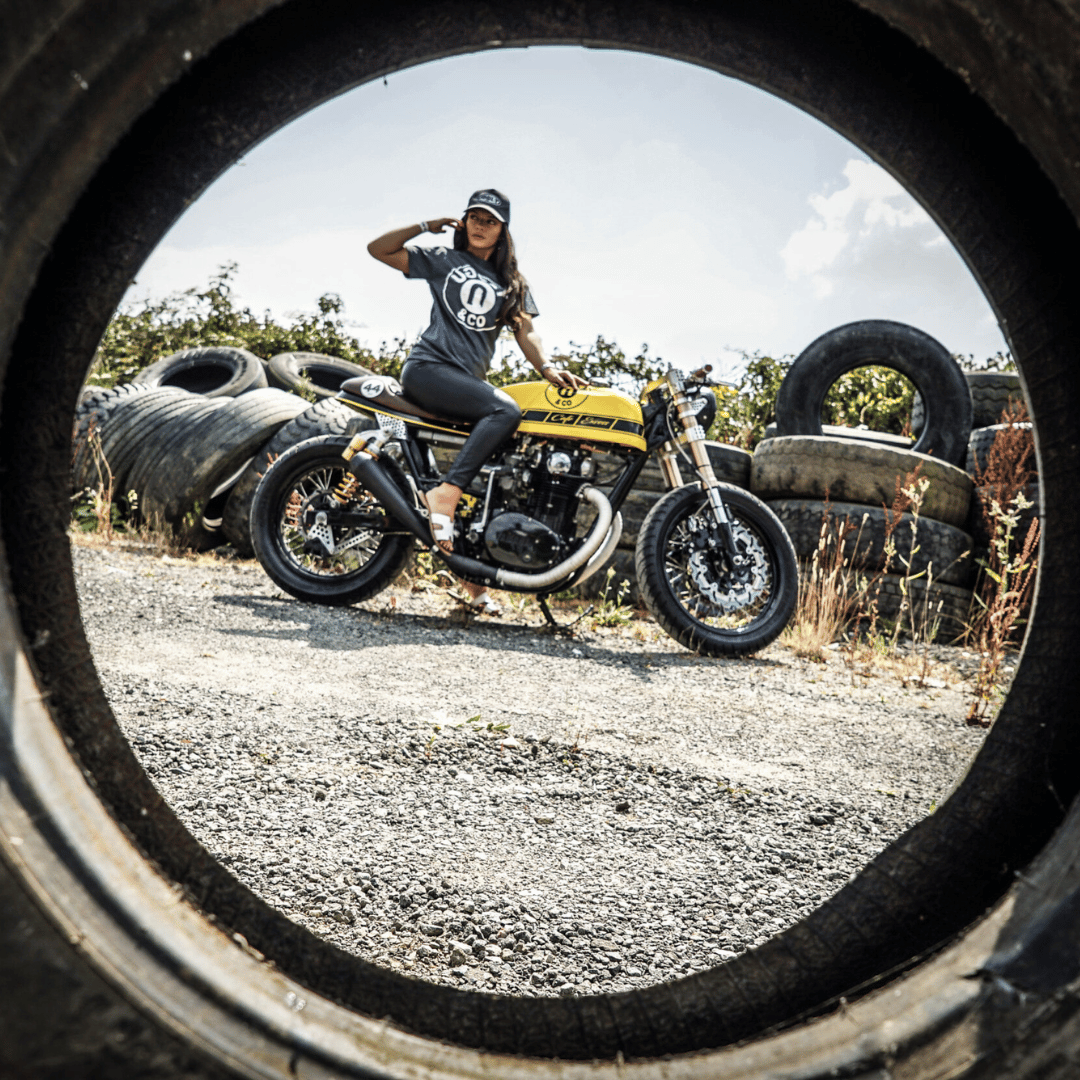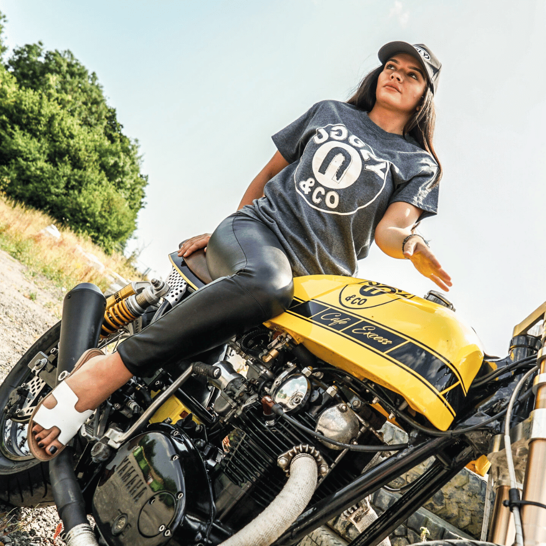 The Circle Tee, our staple logo recognised world-wide as a Motorcycle Lifestyle Clothing Brand on the front and back of the Tee. The design is inspired by American Varsity on the back, printed on a vintage grey heavyweight tee.