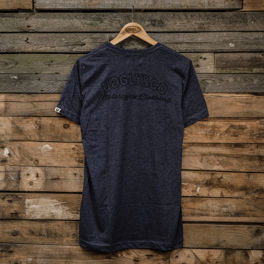 Motorcycle Clothing Tee, in our fitted style fit. With a heather blue, and a dark blue print on the front and back. This Tee is a homage to our belief as a brand. Be confident in yourself and rip’ on bikes, any bikes!