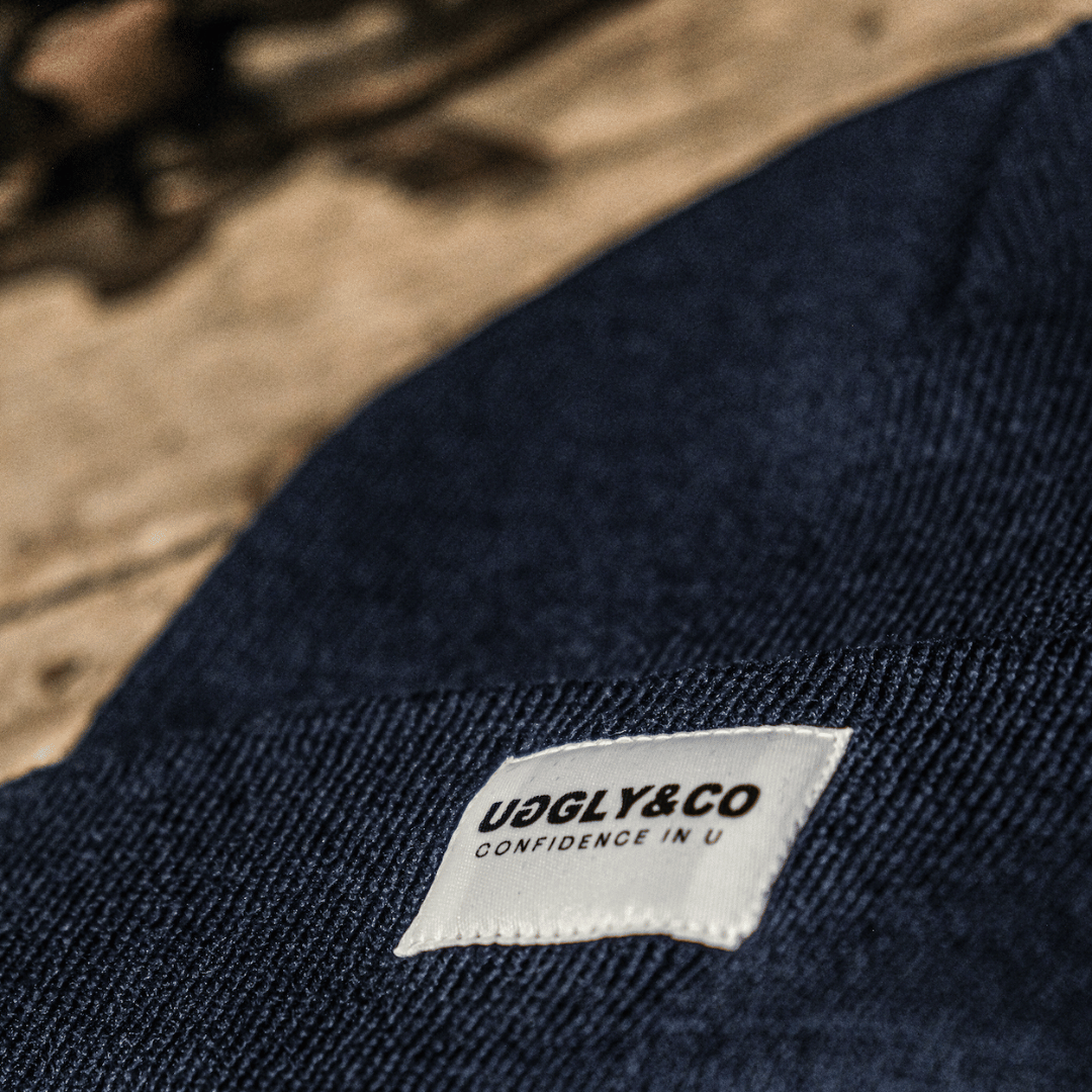 The UGGLY&CO Navy Blue Beanie. A navy beanie with the classic UGGLY&CO design woven on to the front.