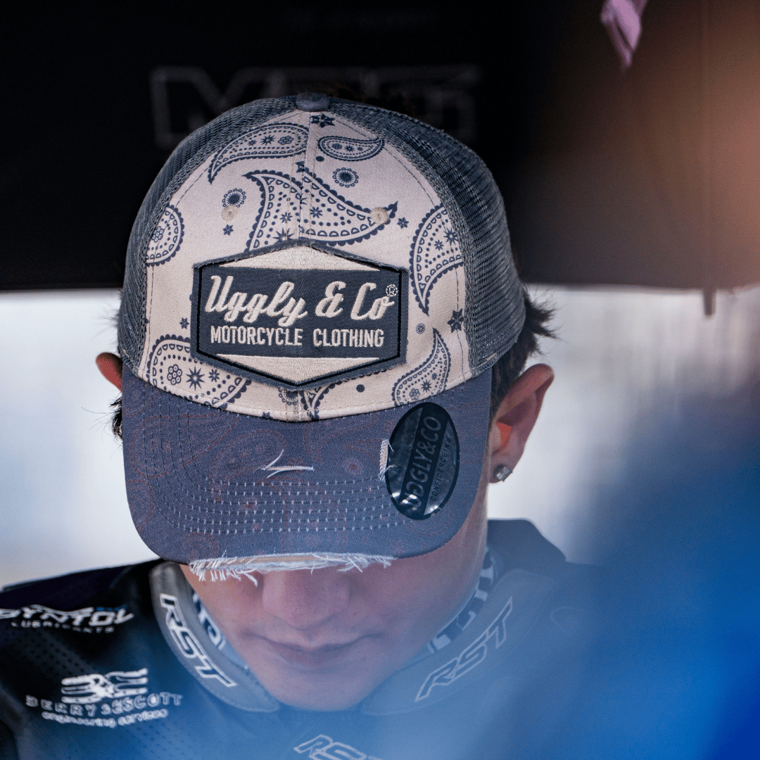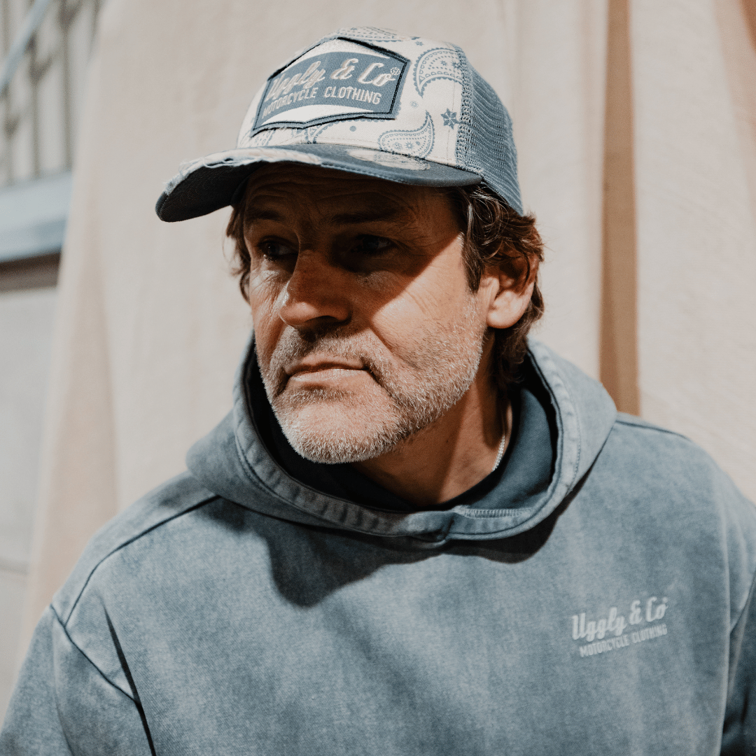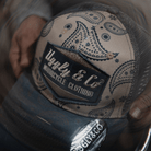 Introducing the Bandana Diamond Cap, a seamless fusion of contemporary style and rugged allure, and the newest instalment in our renowned Diamond Range. This cap embodies the essence of vintage charm, featuring a striking motorcycle retro bandana print on the front, complemented by the familiar rips and tears that define the Diamond Range. A beige fabric is layered beneath the distressed blue, adding an extra dimension of depth and sophistication.