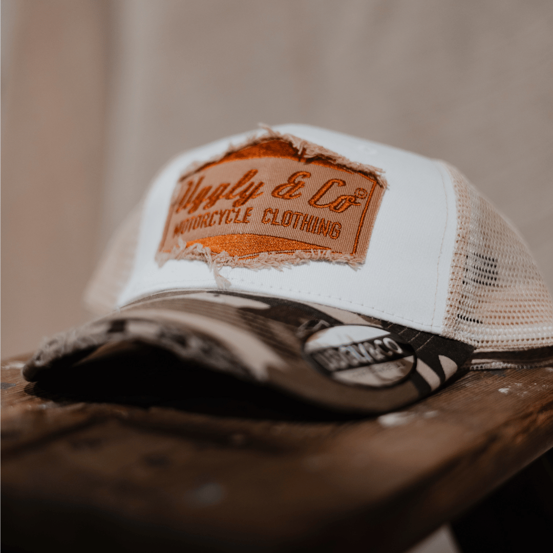 The front panel features a crisp white backdrop, showcasing our signature Diamond logo in a rich brownish-red hue—a hallmark of quality and craftsmanship that has become synonymous with our brand. The washed-out camo pattern on the peak is artfully distressed, featuring intentional tears and frays that add a rugged, lived-in charm, staying true to the iconic Diamond Cap range.
