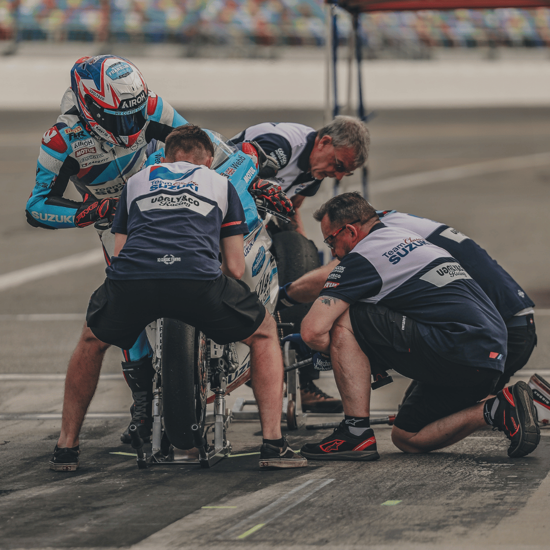 Crafted to perfection, the jacket’s design mirrors the striking colorway of the Team Classic Suzuki bikes. The back features an oversized Suzuki embroidery paired with bold Uggly&Co branding, creating a standout look that turns heads both on and off the track. Logos from Carl Cox Motorsport, Motul, Benjamin Franklin Brewery, and Uggly&Co are prominently displayed on the arms and throughout the design, solidifying its official status.