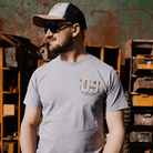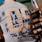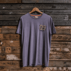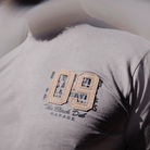 Printed across the back is a dark blue graphic, sharp and industrial, with a beige ‘09’ appliqué stitched right over the top using our signature Applicae process. That means we take another layer of fabric and sew it directly onto the tee — giving it depth, texture, and a one-of-a-kind feel you won’t get off the shelf.