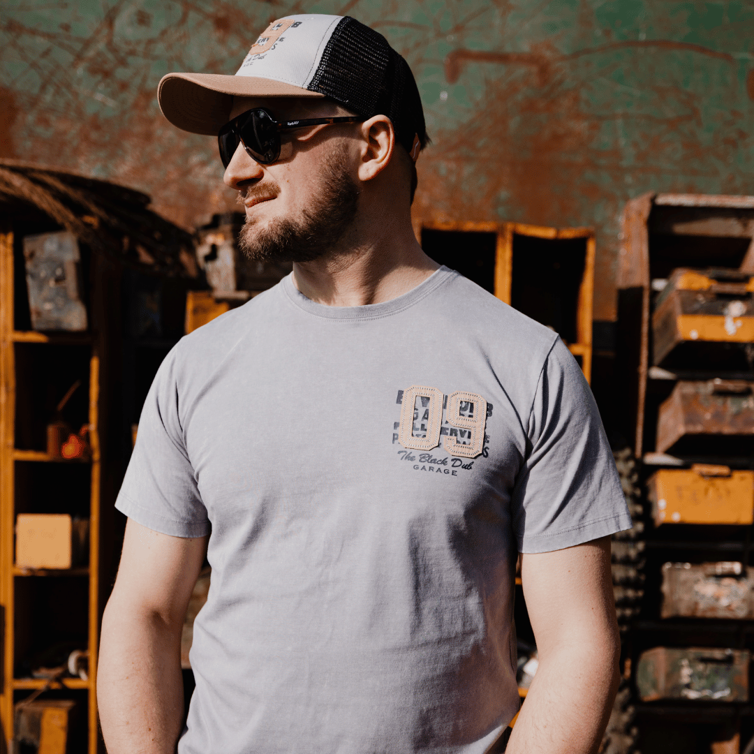 The Grey Parts & Spares ‘09’ Tee is a heavyweight from Collection 2.0 — built with character, crafted with care. Each tee is acid washed over several days to achieve a faded, worn-in finish that feels straight out of the pits.