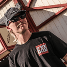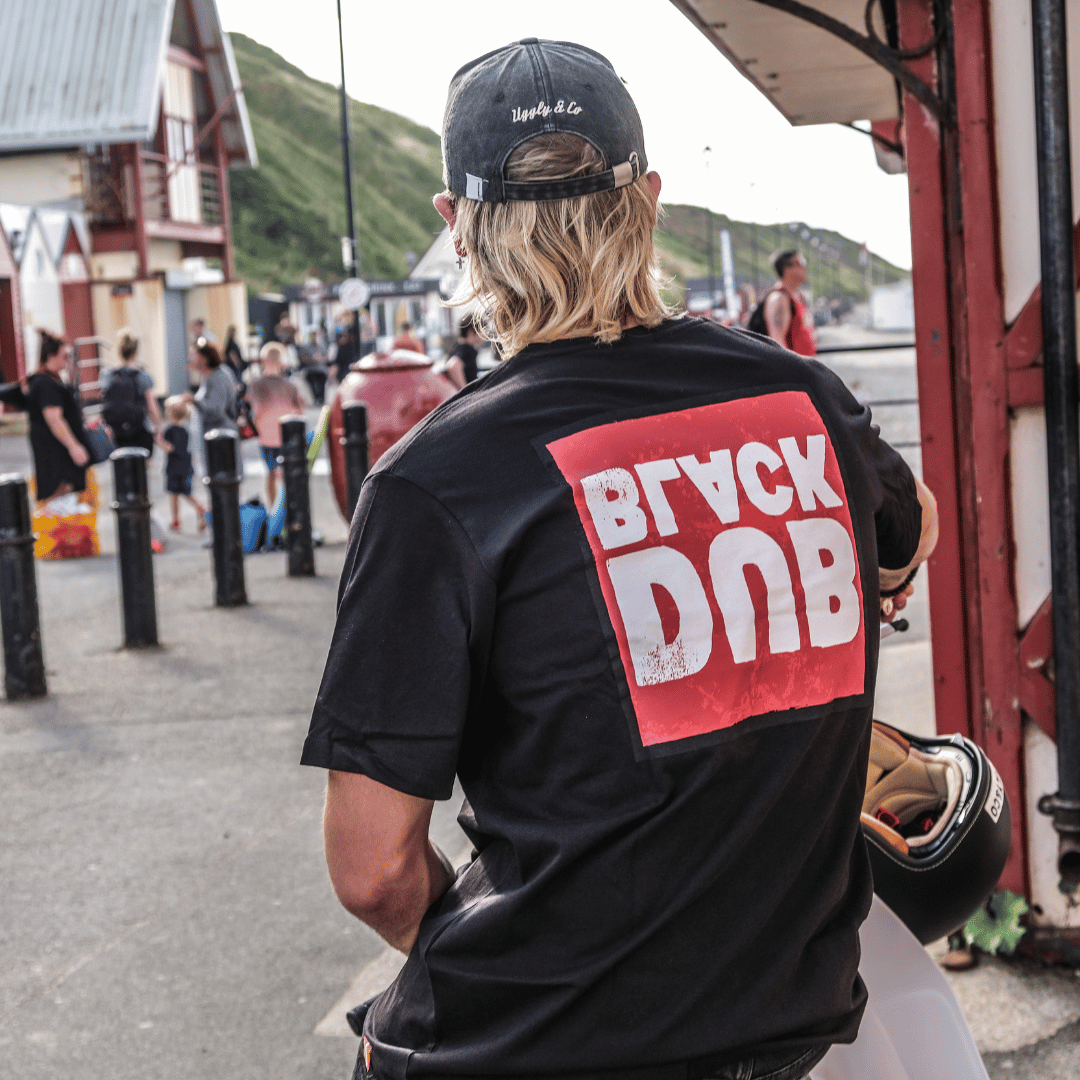 The design is inspired by vintage garage logos painted on the sides of black-walled buildings, capturing the essence of classic signage and marketing from years past. The bold red logo on the black tee stands out with a vibrant flair. True to the Black Dub range, it features a small orange tag of the signpost on the bottom of the tee and an orange neckline, a nod to its heritage as an iconic spot of the Isle of Man TT.