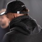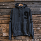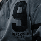 Introducing the collaborative masterpiece from Uggly&Co and The Black Dub, Mile 9: The Baseball-Inspired Hoodie. At its forefront, a weathered fabric baseball-style number 9 is skillfully sewn on, adorned with tassels and distressed edges, proudly showcasing the embroidered "Black Dub Garage" beneath.