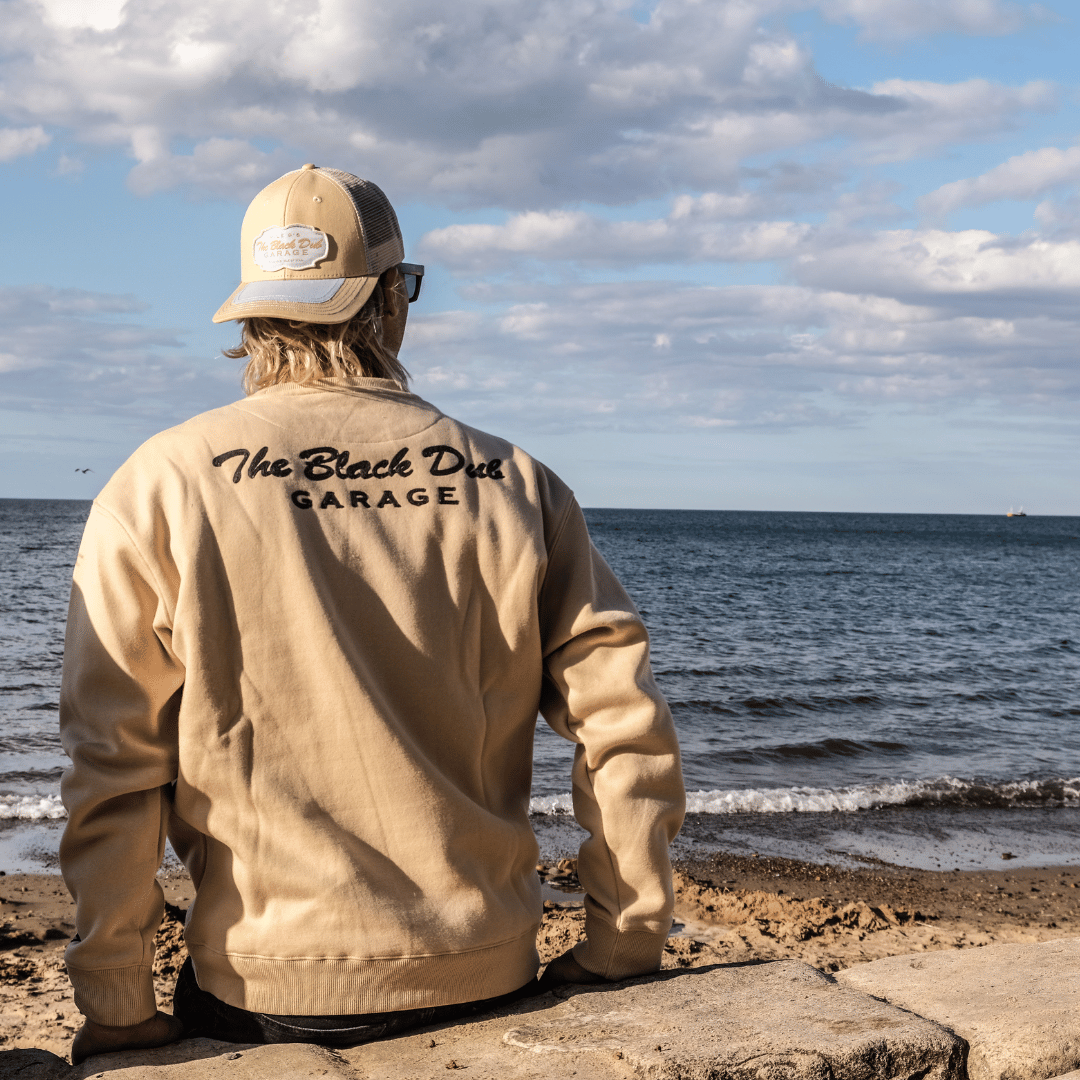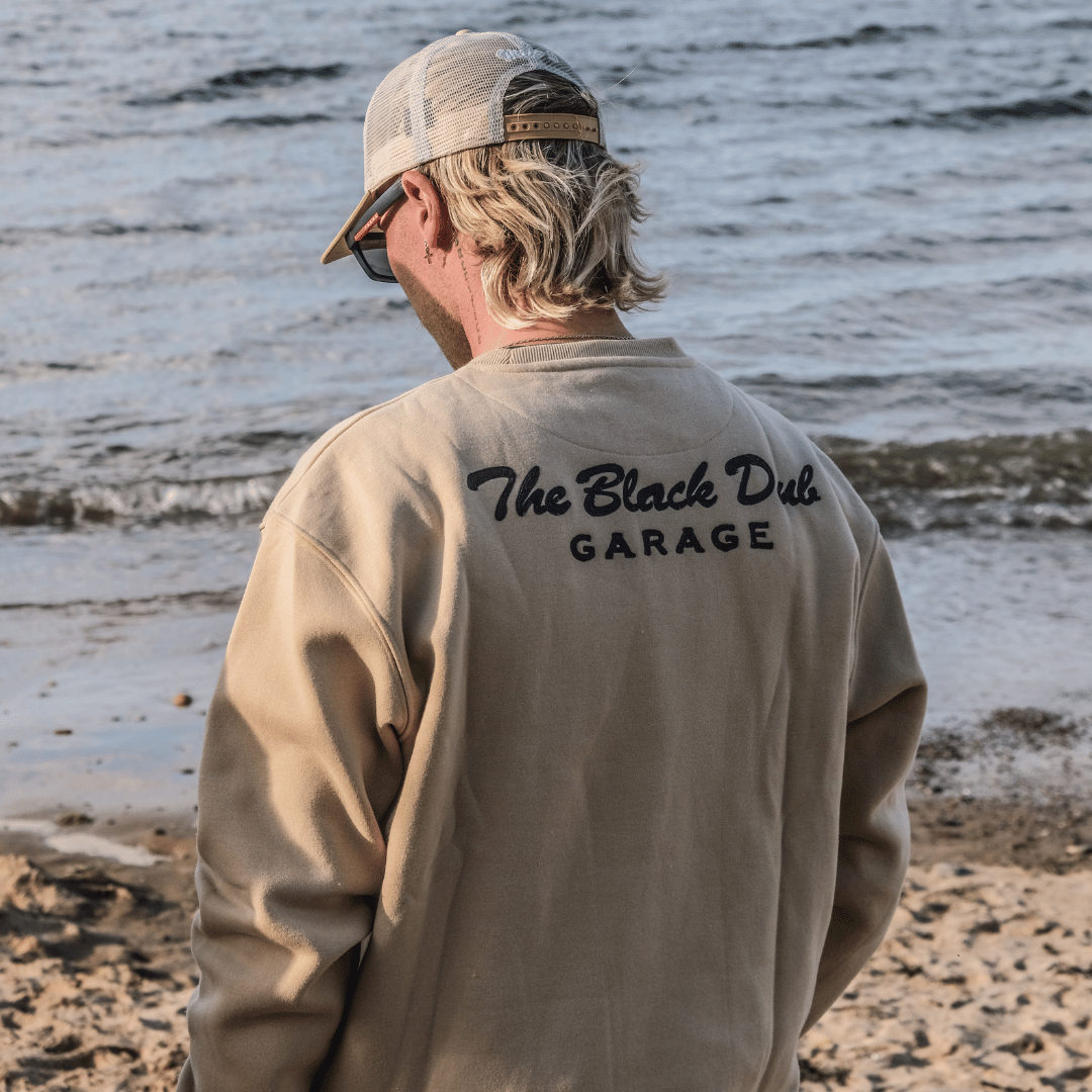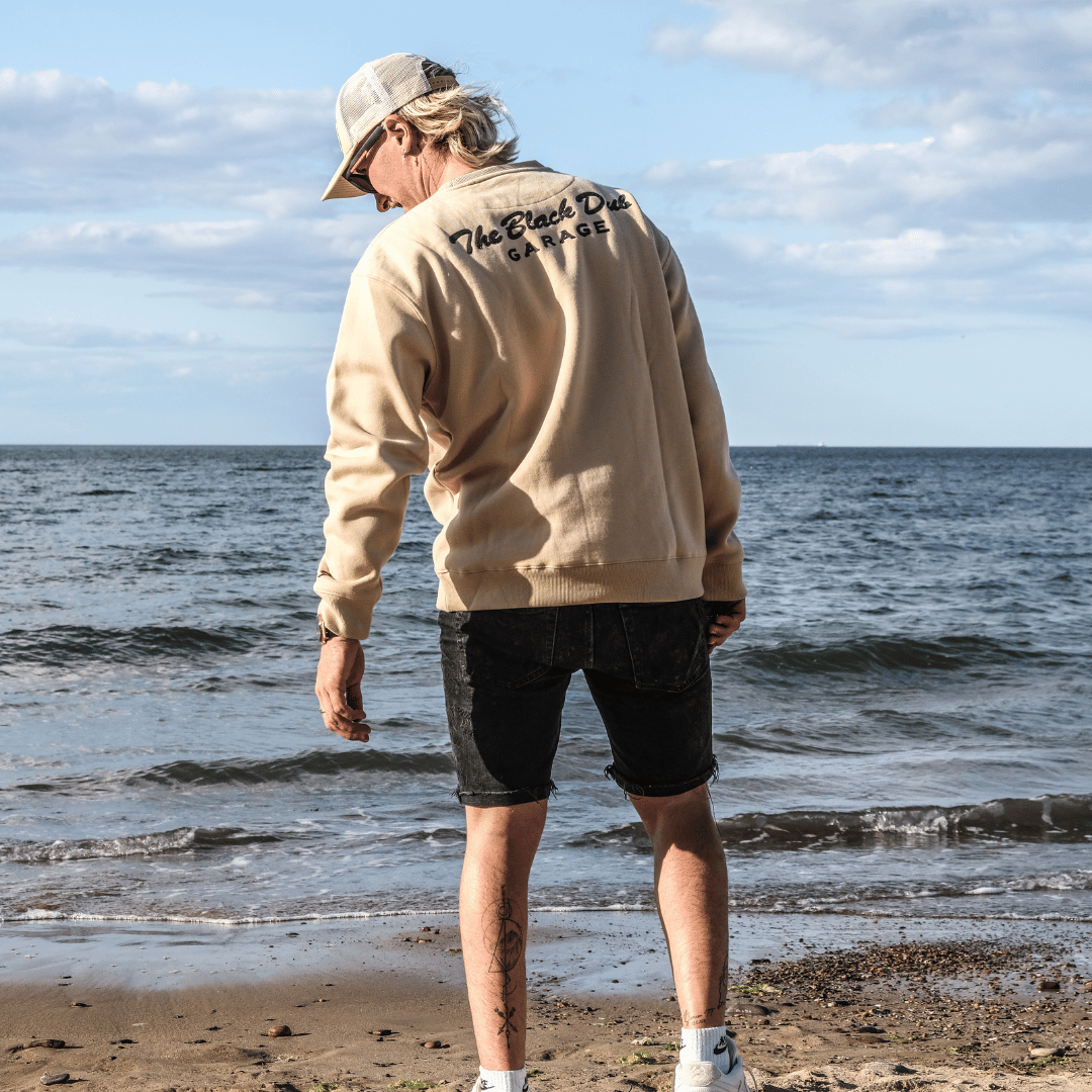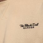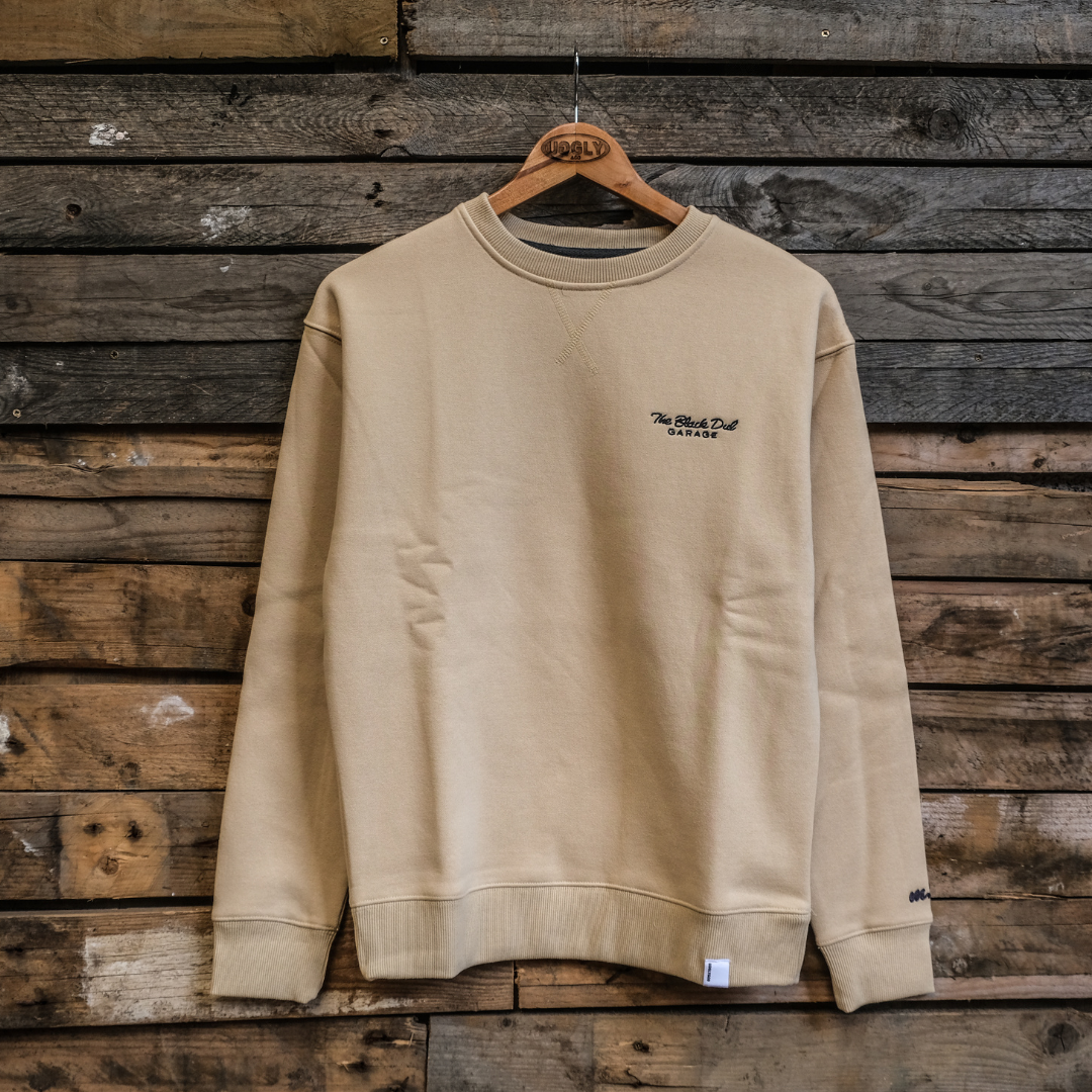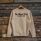 Introducing The Black Dub Garage Jumper, a tribute to the classic workwear once synonymous with garages and petrol stations across Britain. This beige jumper features unique 'Chainlink Embroidery' in black on both the front and back, inspired by the intricate patterns of motorcycle chains layered together for a vintage effect.