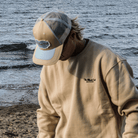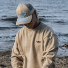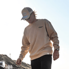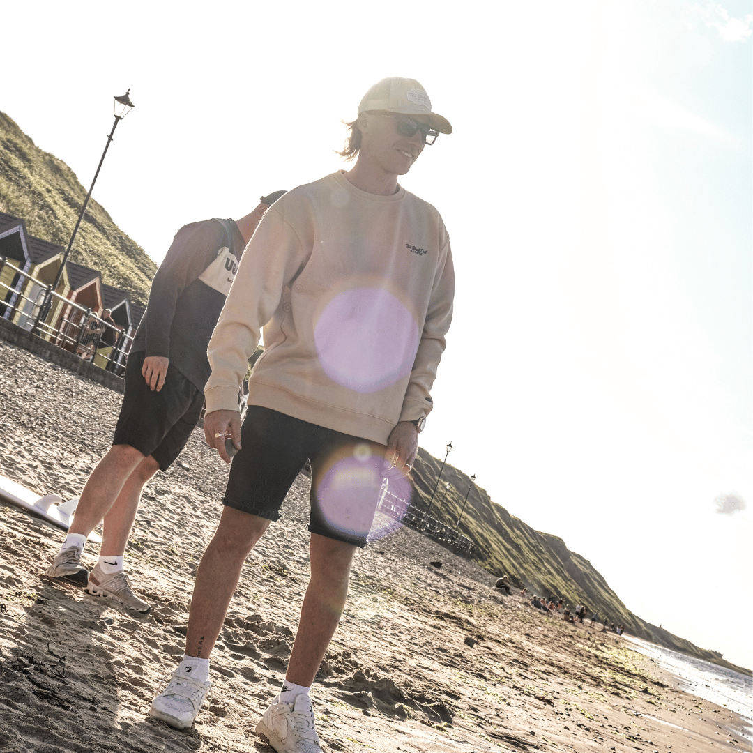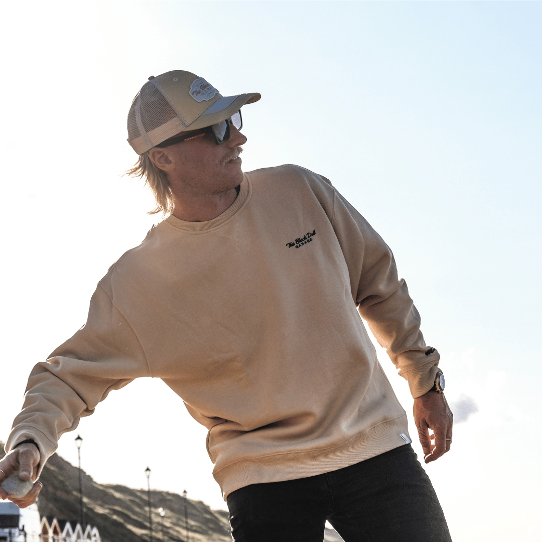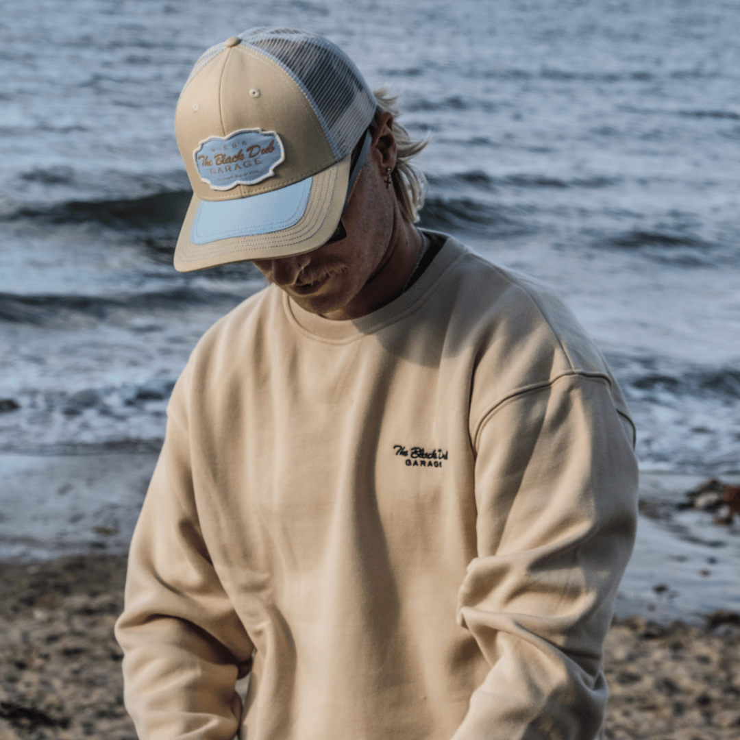 Introducing The Black Dub Garage Jumper, a tribute to the classic workwear once synonymous with garages and petrol stations across Britain. This beige jumper features unique 'Chainlink Embroidery' in black on both the front and back, inspired by the intricate patterns of motorcycle chains layered together for a vintage effect.