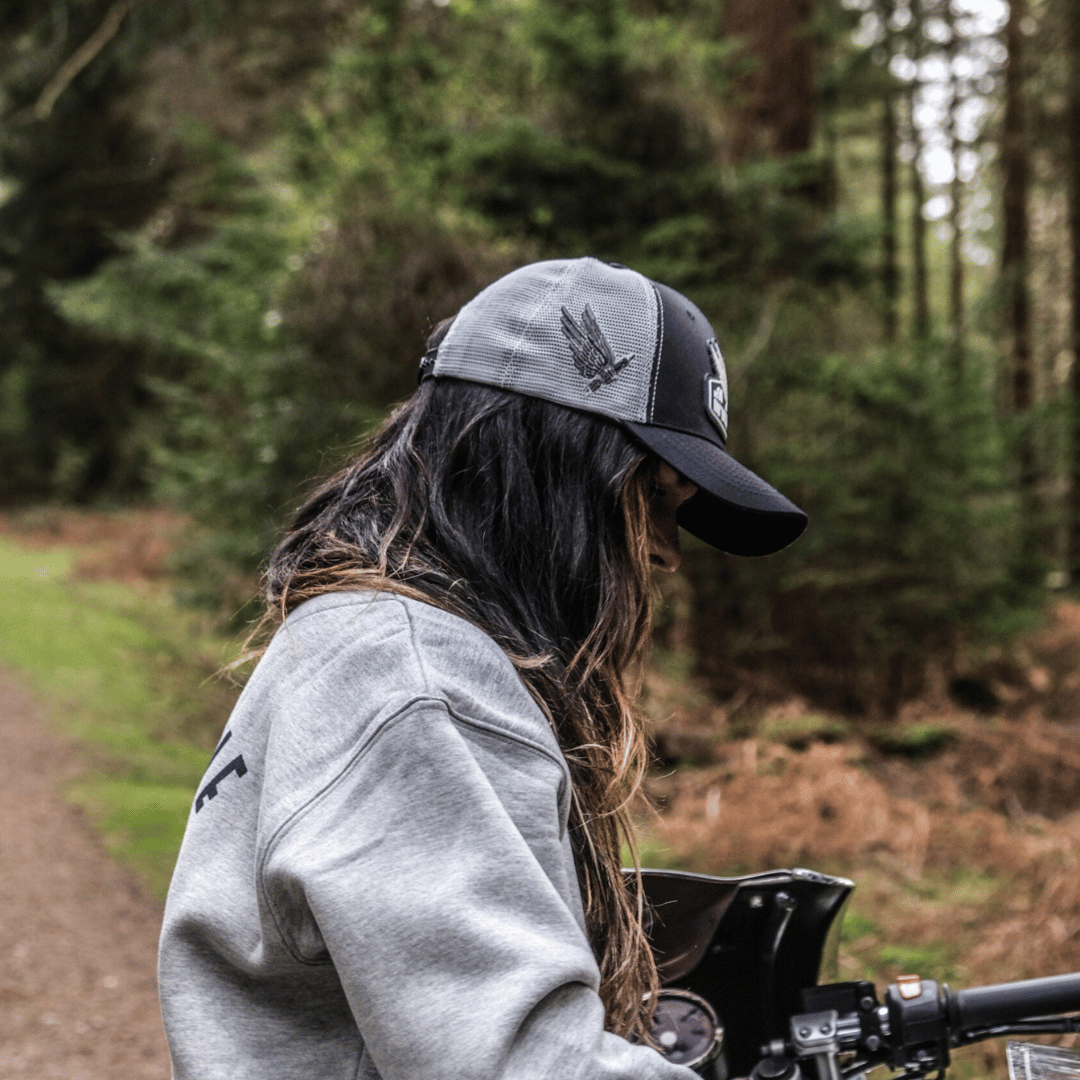 The Wings Cap, features The Black Dub spark plug design, on the front of the cap in a standout Blue & Grey. Fitted on a dark navy blue Cap with a grey mesh. The front design takes inspiration from vintage Petrol Station designs used in the 60’s & 70’s. A homage to the history of The Black Dub, Petrol Station & Garage.