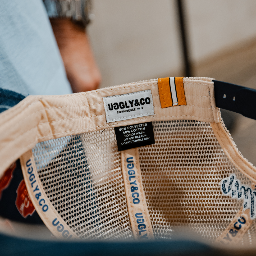 Meticulously curated, this cap boasts our distinctive garage logo prominently displayed on the front in bold red. Constructed from authentic denim cuts, it guarantees exceptional durability and enduring comfort. The design features beige mesh panels that mimic the look and feel of denim jeans, adding a unique touch. This intricate construction gives the fabric a textured effect, evoking an authentic vintage appeal that sets it apart. Purposeful frays and weathered accents are carefully integrated into the design, infusing it with a rugged character that ensures each cap is one of a kind.