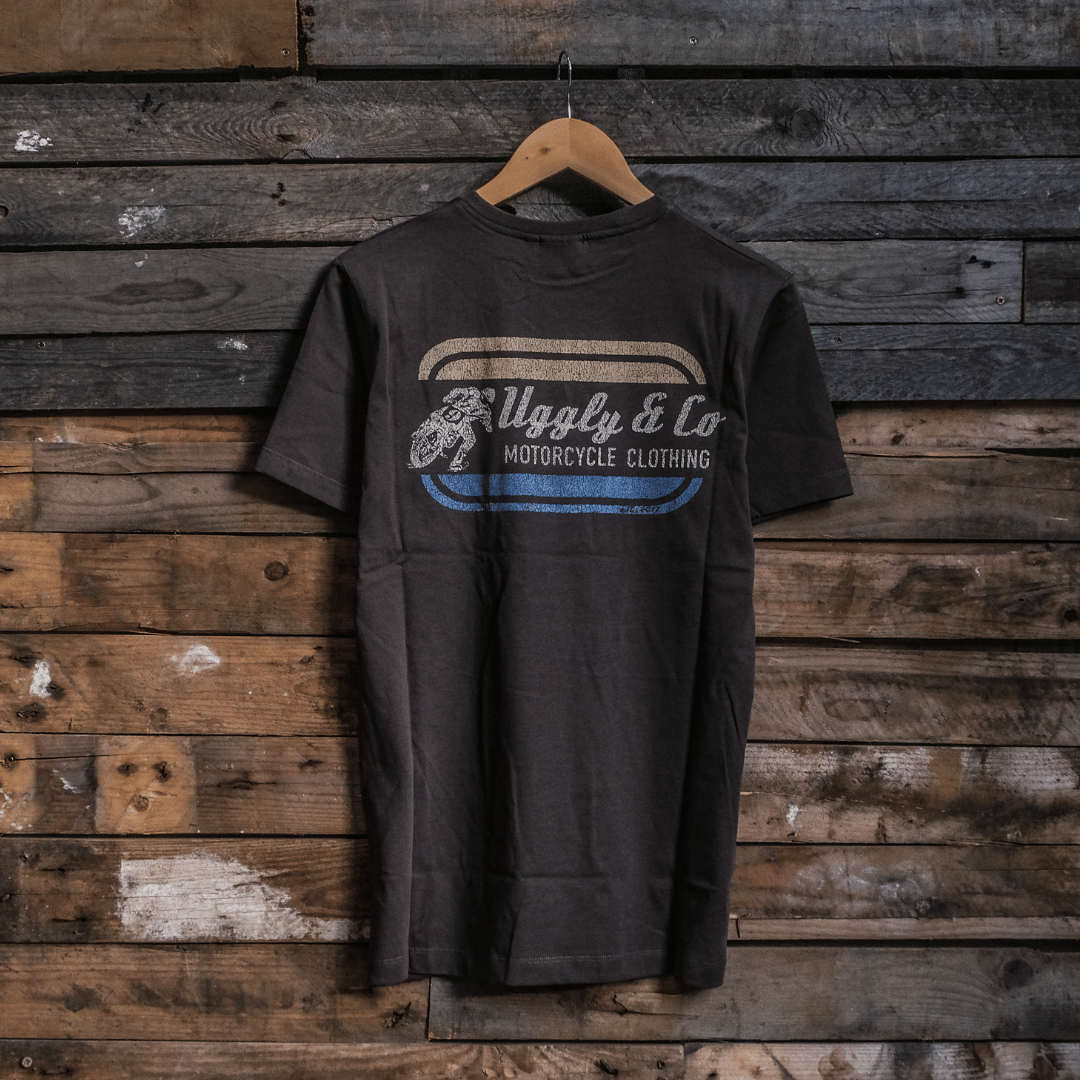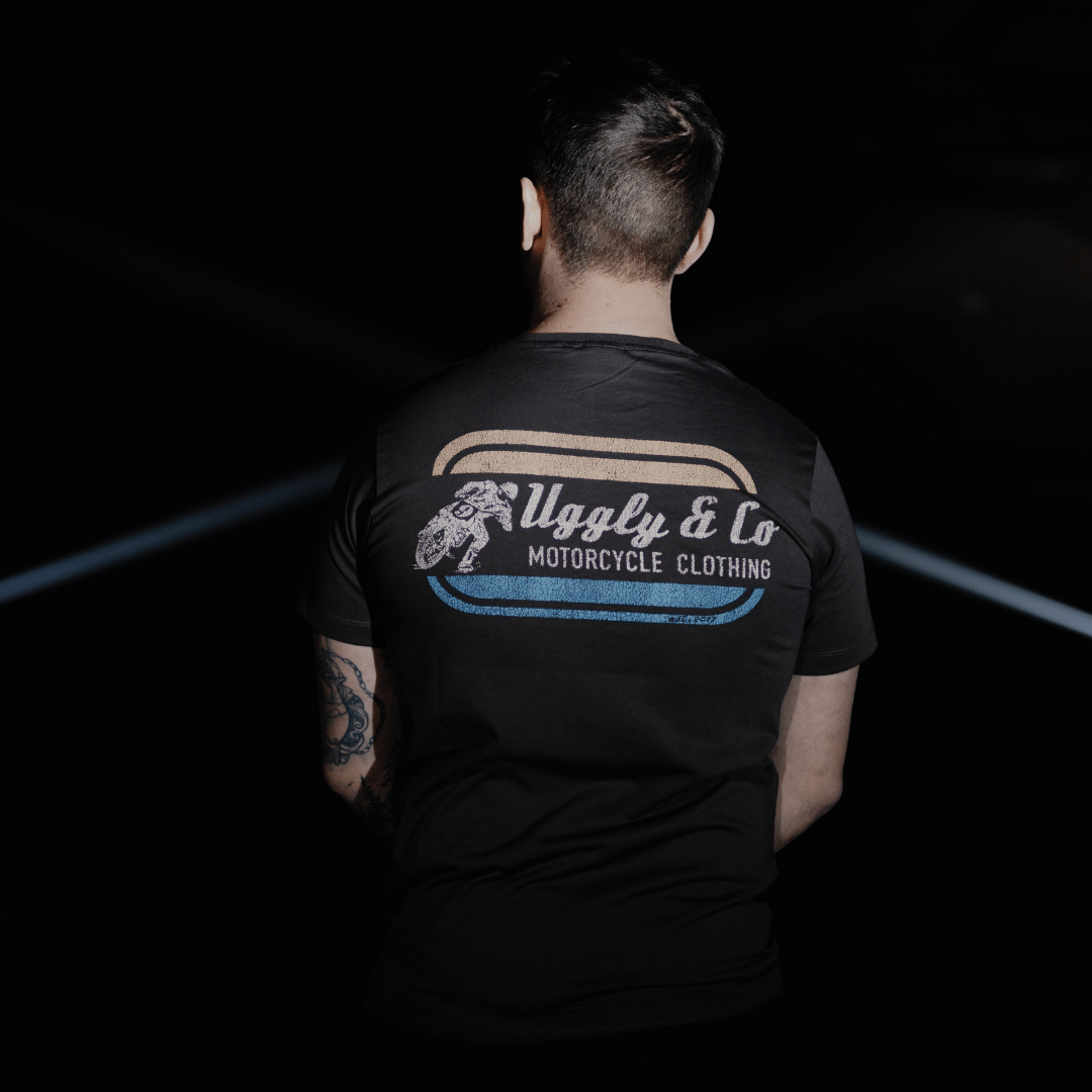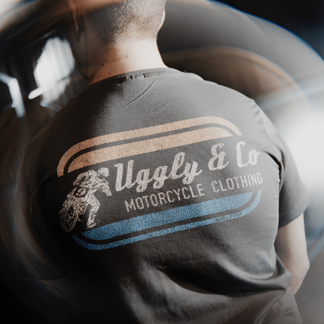 At the core of this design is a hand-sketched illustration of a vintage racer, featured on both the front and back. The rider is captured mid-slide in a signature tipped-over stance, paying homage to the art of flattrack racing. Drawn from historic photographs, every detail—from the sharp lean of the bike to the spray of dirt—tells a story of speed, precision, and daring control. The front design showcases the racer sliding across the Uggly&Co logo, creating a dynamic, high-energy focal point.