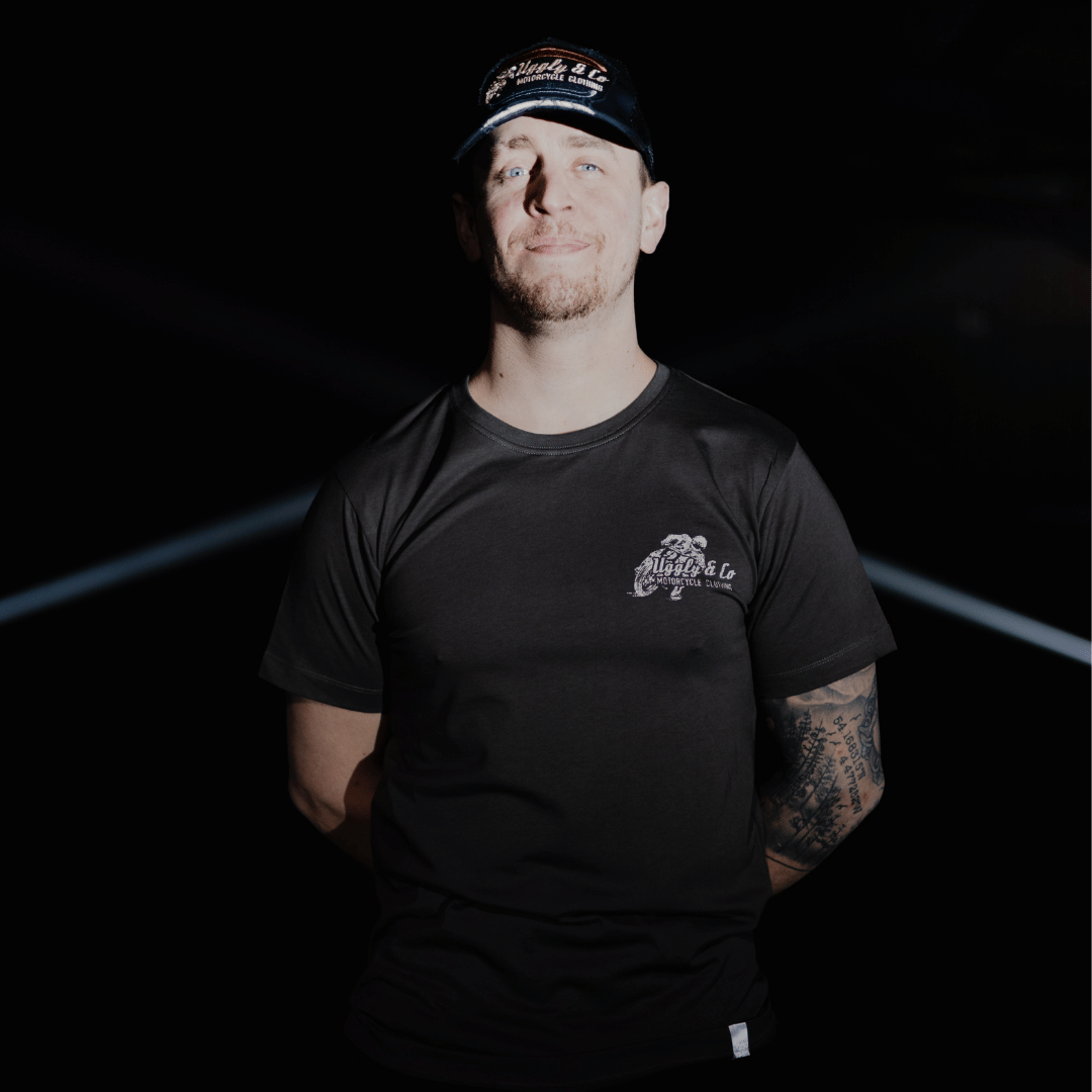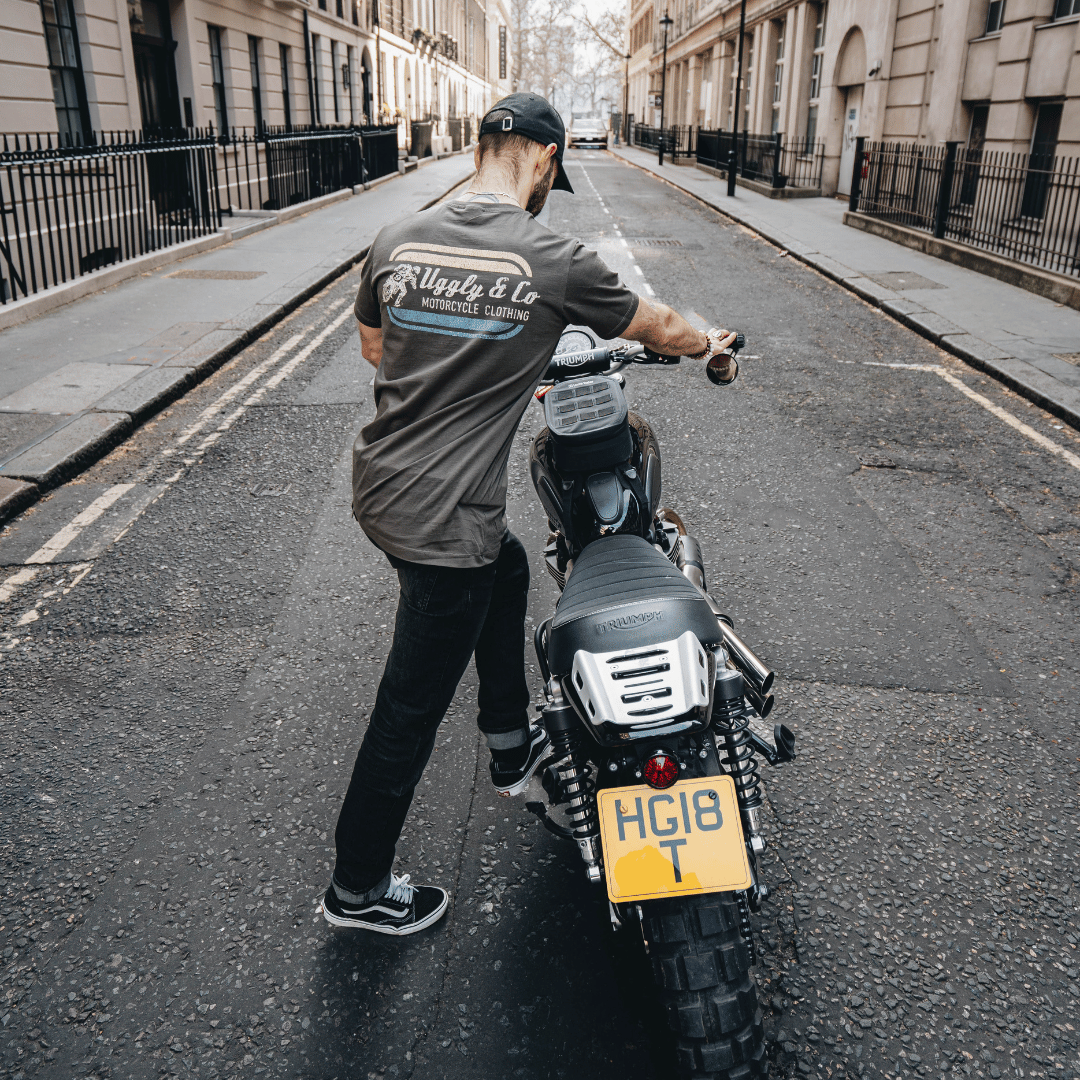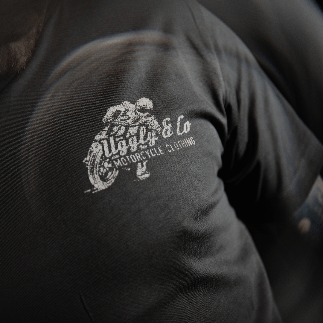 At the core of this design is a hand-sketched illustration of a vintage racer, featured on both the front and back. The rider is captured mid-slide in a signature tipped-over stance, paying homage to the art of flattrack racing. Drawn from historic photographs, every detail—from the sharp lean of the bike to the spray of dirt—tells a story of speed, precision, and daring control. The front design showcases the racer sliding across the Uggly&Co logo, creating a dynamic, high-energy focal point.