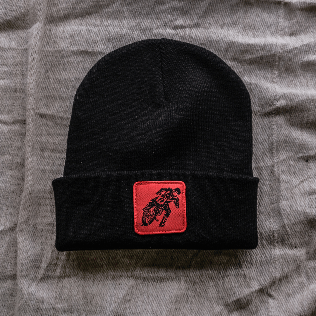 The Flattrack Racer Beanie is a true nod to the sideways style of vintage dirt track culture. Made from soft black knit, it features a bold red patch of a racer sliding through the corner — a symbol of raw speed, control, and attitude. It’s a clean, understated piece that captures the spirit of the Uggly&Co racing heritage.