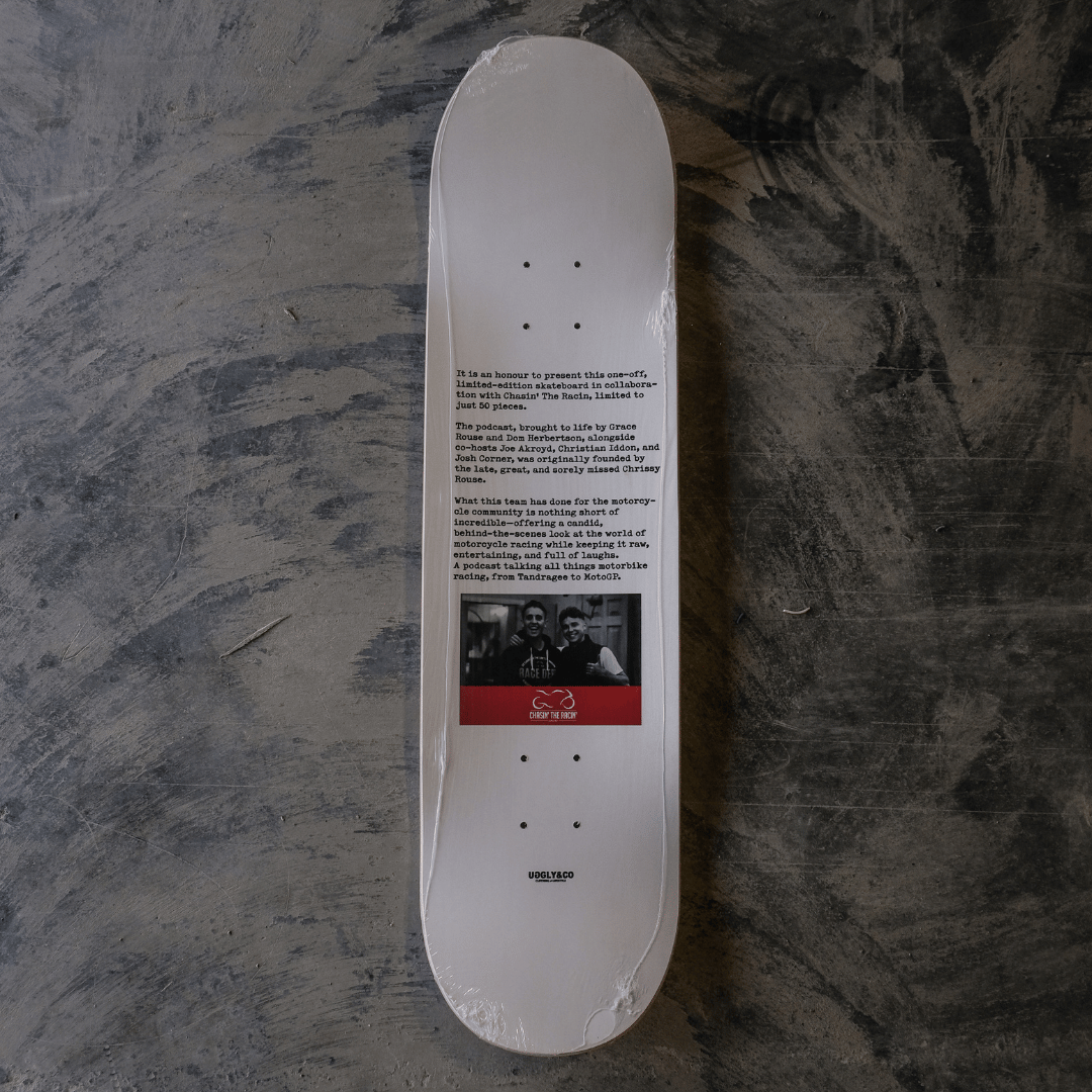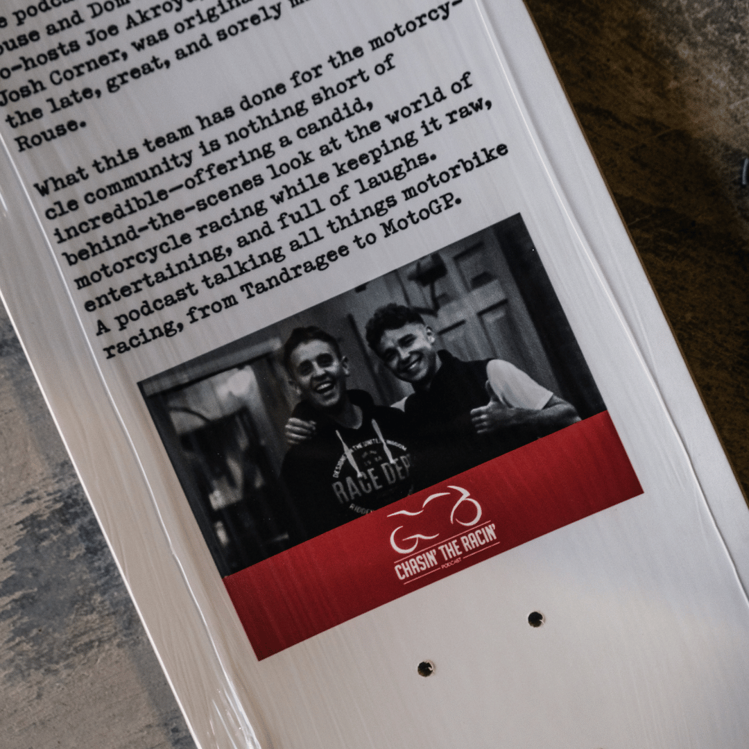 A tribute to one of the most iconic motorcycle podcasts in the world, the Chasin’ The Racin’ Skateboard Deck is more than just a board – it’s a piece of racing history.