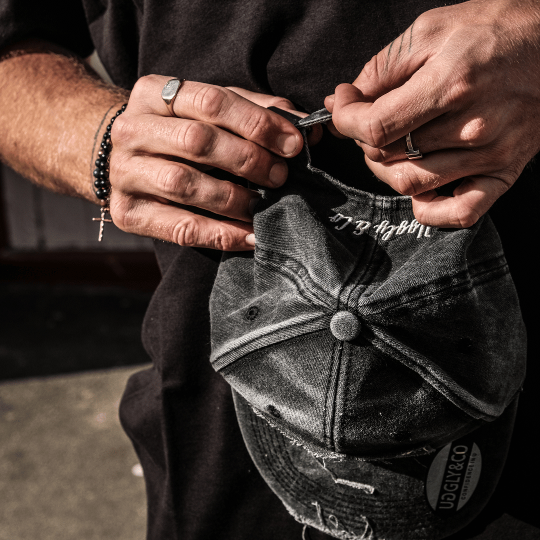 Chaque élément de cette casquette a été méticuleusement sélectionné, avec notre logo en diamant distingué tissé bien en évidence sur le devant. Fabriqué à partir de matériaux de première qualité, il garantit une durabilité et un confort inégalés. Le processus complexe de lavage à l'acide confère au tissu une esthétique vieillie, invoquant une allure vintage authentique qui le distingue des autres. Les bords effilochés soigneusement intégrés et les accents vieillis confèrent au capuchon un caractère distinct, garantissant que chaque pièce se démarque comme une œuvre d'art exclusive.