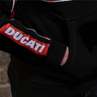 Down the arms, you’ll find the full lineup of official team sponsors, including the iconic Ducati logo in classic red and white — giving it authenticity straight from the paddock. The hood itself is black on the outside but lined with red fabric on the inside for that extra hit of detail. Even the kangaroo pocket on the front features red stitching, finishing it off with precision.