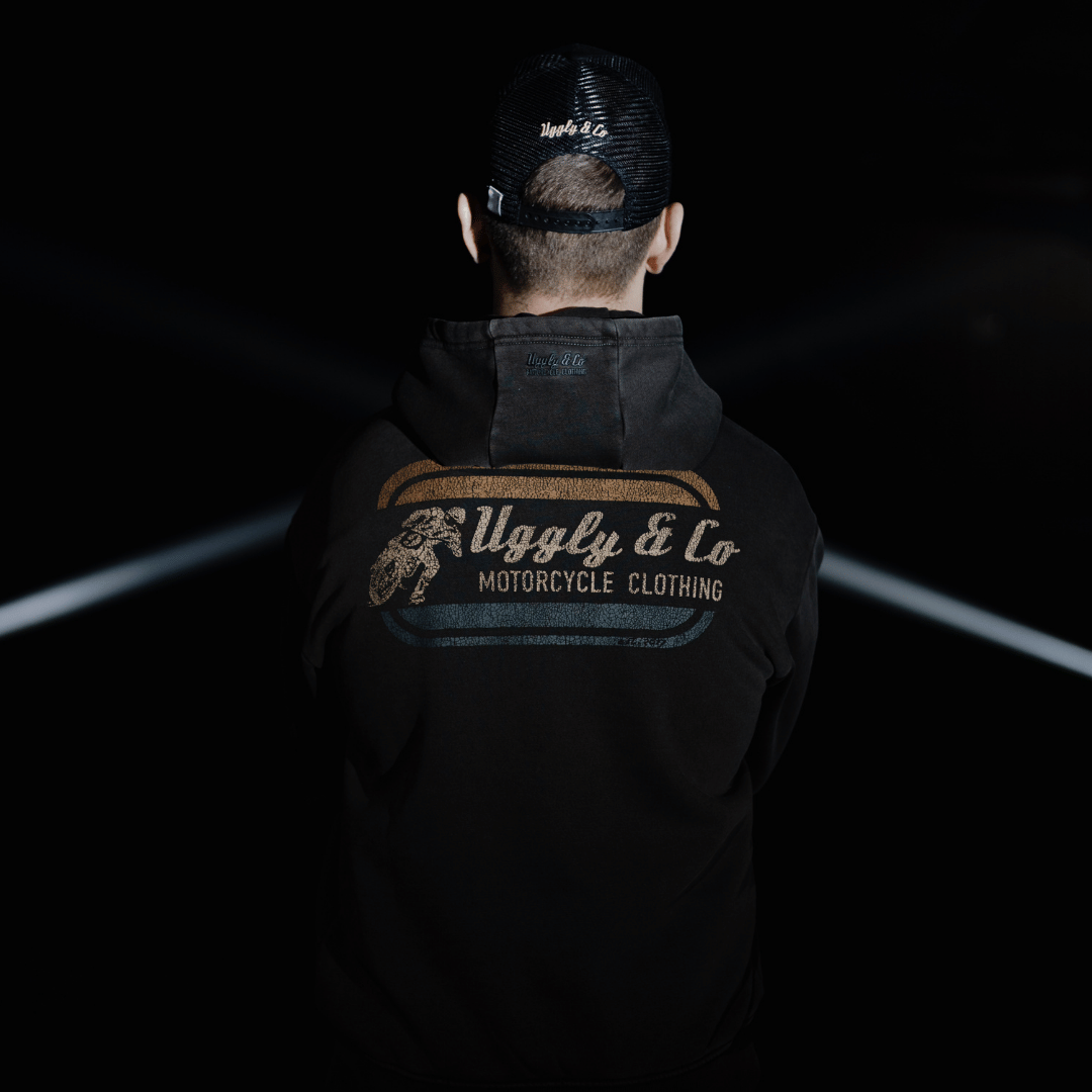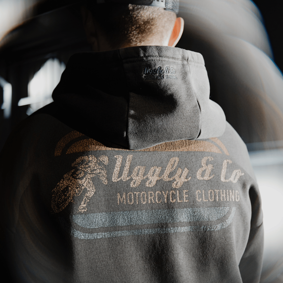 Crafted from our premium heavyweight soft cotton, this hoodie is designed for comfort and durability, making it ideal for all-day wear. The oversized back print showcases the bold Flattrack design, while the front features a smaller rider illustration, paired with the unmistakable Uggly&Co Motorcycle Clothing logo—a nod to our deep connection with motorcycle culture.