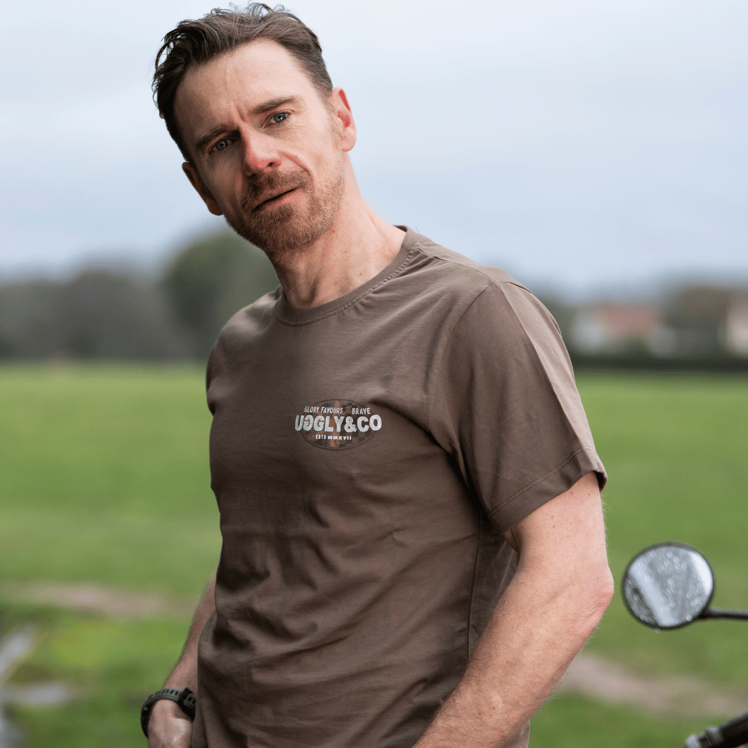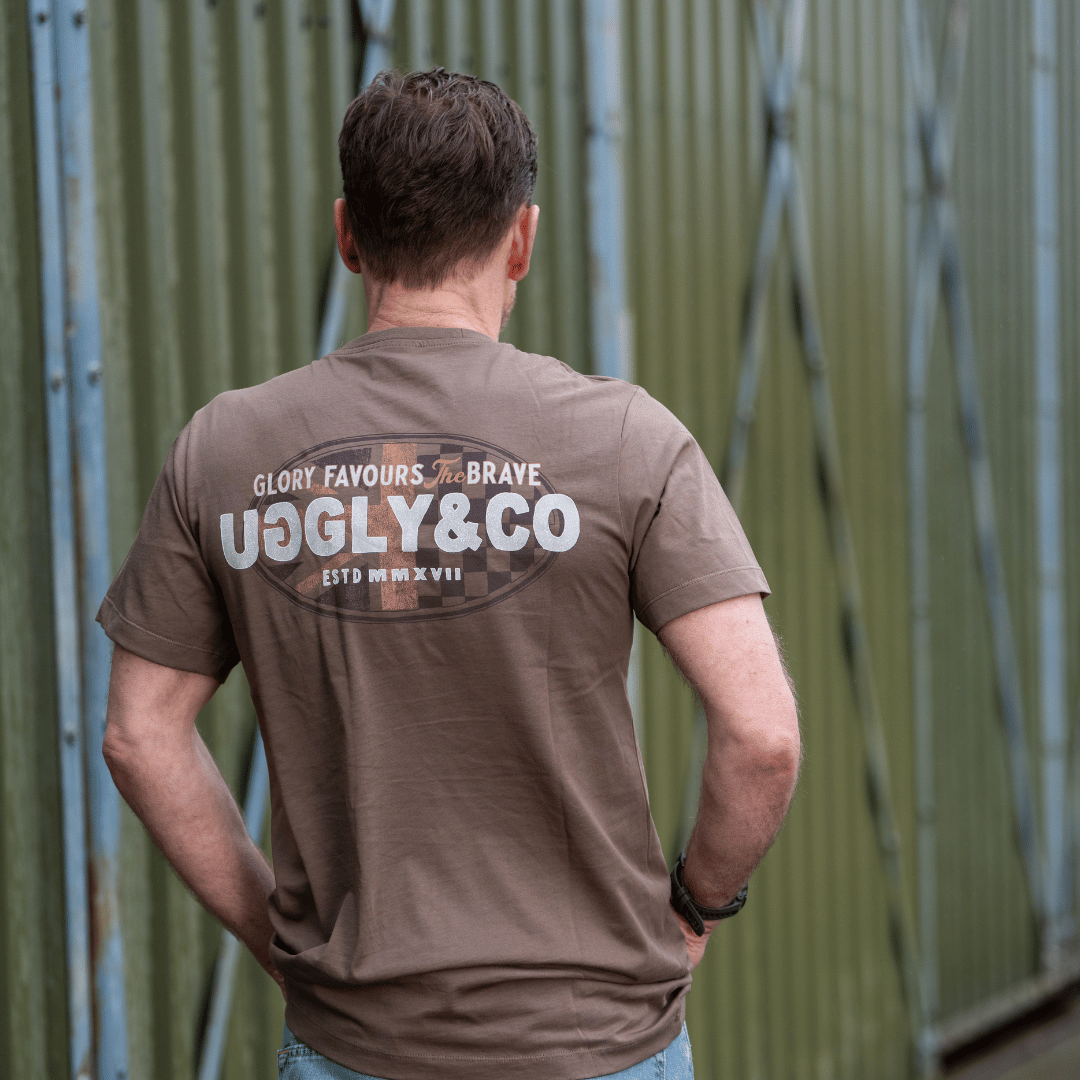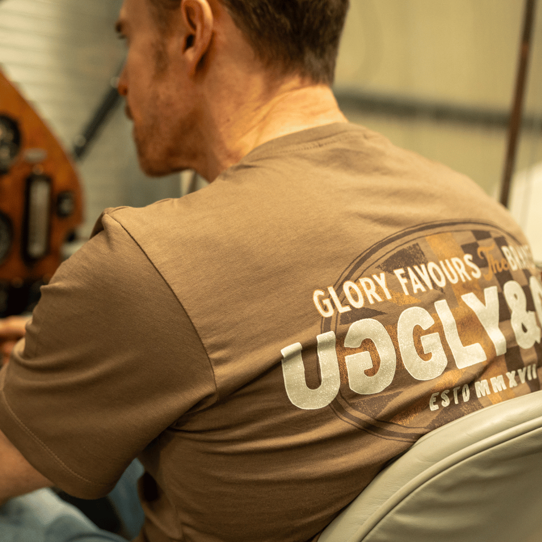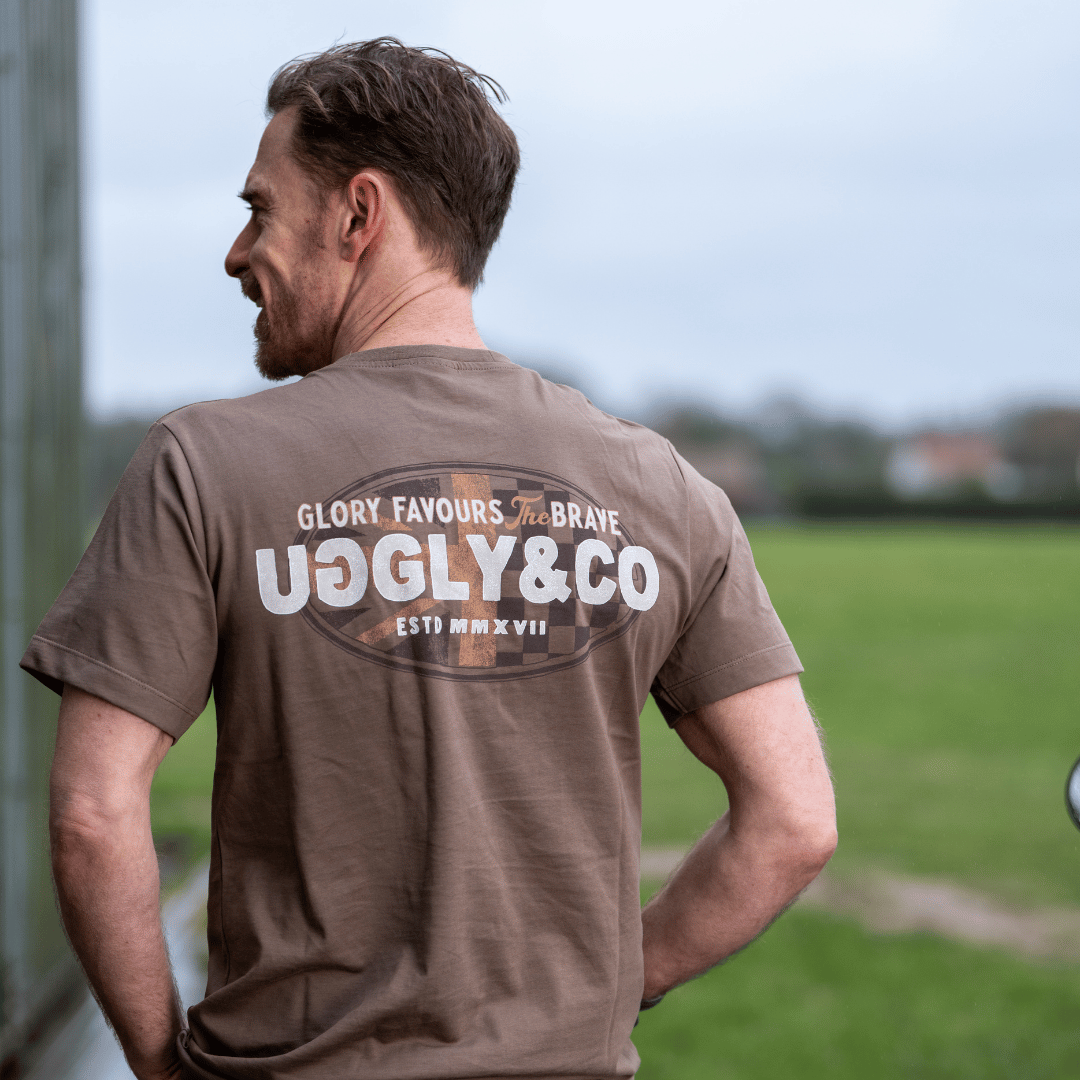 The graphic combines a classic chequered flag, crossed with the Union Jack, creating a powerful symbol of our love for racing and the British motorsport legacy. At the centre of it all, a large Uggly&Co logo bursts through, completing the design with a modern touch that stands out against the earthy brown hue.