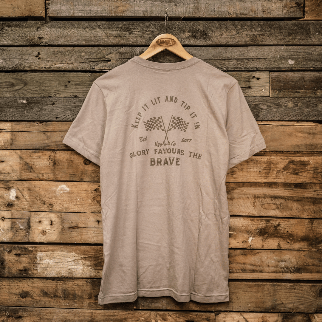 The Flat-Track Tee, is part of our ‘Glory Favours the Brave’ Collection. With inspiration taken from Flat-Track racing, some wise words… ‘Keep it Lit, and Tip it In!’ This Tee is a homage to our belief as a brand. Be confident in yourself and rip’ on bikes, any bikes!