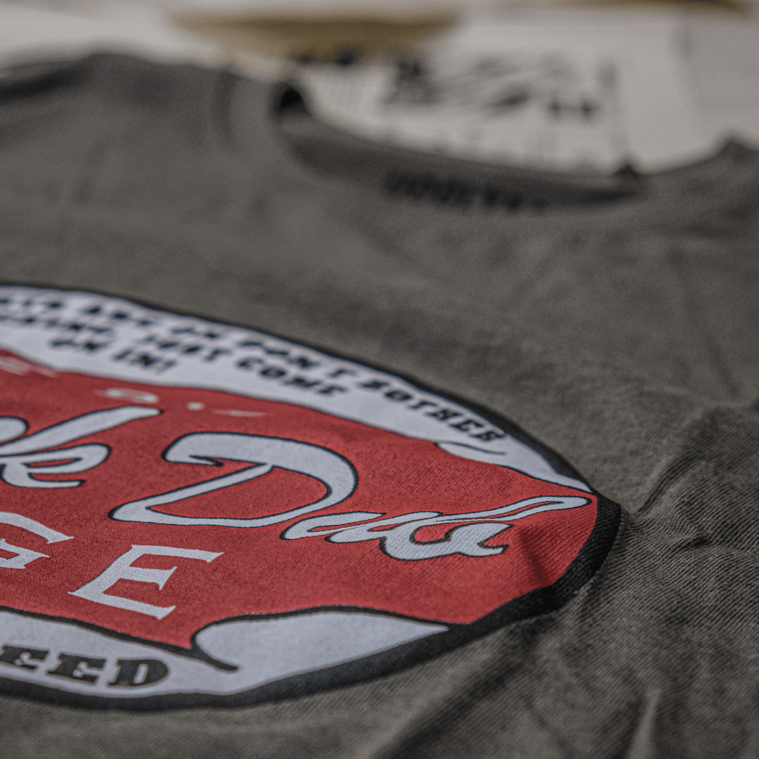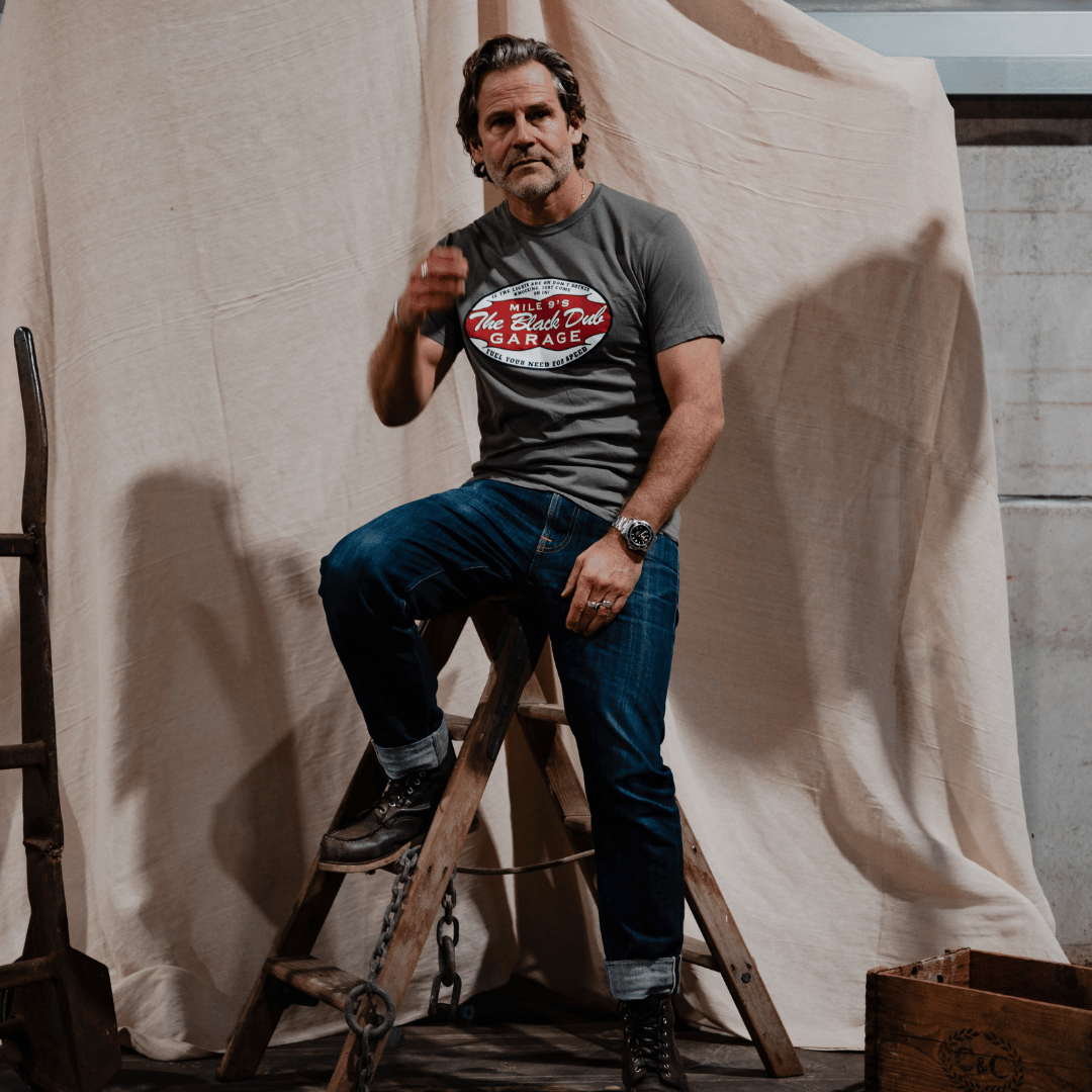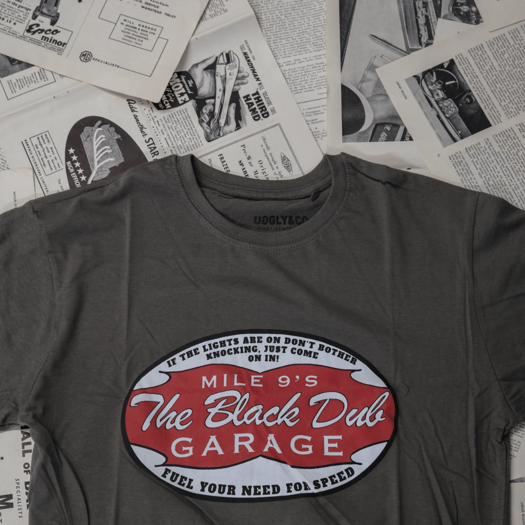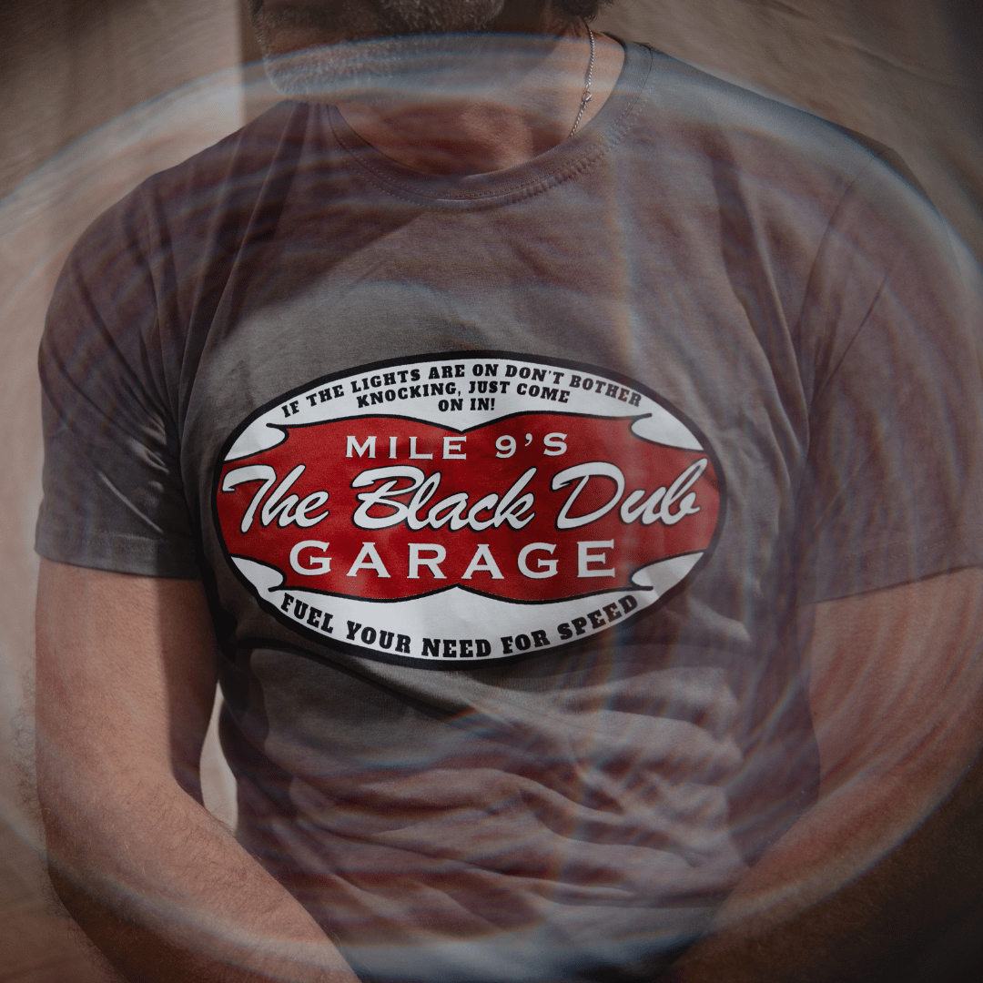 At its core, the tee features a bold, vintage-inspired oval garage logo, paying homage to Mile 9’s Black Dub Garage, a place once filled with the scent of petrol, the sound of roaring engines, and the stories of riders chasing speed. The red and white design echoes classic retro petrol station signage, reinforcing the deep connection to the garage’s past.